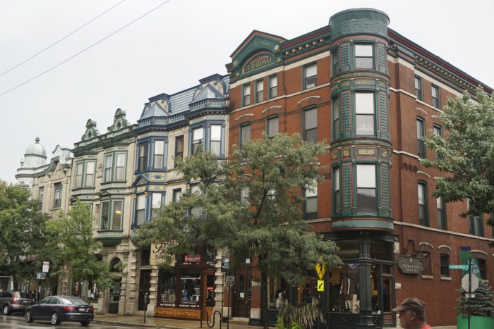 Ich erstehe ein Dreitagesticket für die U-Bahn und beginne sogleich mein ÖPNV-Schädigungsprogramm. Eine oberirdisch fahrende Strecke soll es sein, damit ich trotz Shitwetter bequem was sehen kann. Rein in die Brown Line und ab nach Norden. Das Zufallsprinzip treibt mich in der Station Armitage raus in den mittlerweile schwächer werdenden Nieselregen. Und siehe da, Chicago kann auch klein und Altbau: