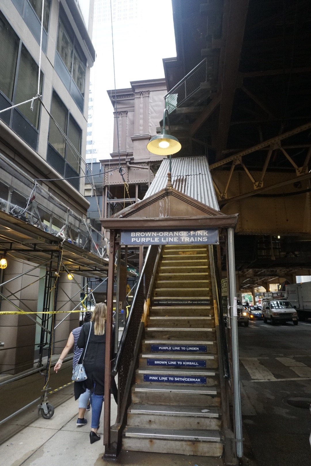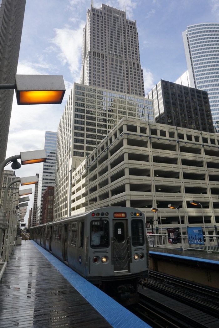 Hoffnungsvoll trabe ich nach einem kleinen Rundgang durch das hübsche Viertel zurück zur U-Bahn. Der Regen lässt nach. Die Purple Line bringt mich zurück in die Innenstadt und zum Thema des heutigen Tages: The Loop, das Herz der Stadt. Eine Hochbahn, Ende des 19. Jahrhunderts gebaut, fährt im Kreis oder besser gesagt im Oval um die Innenstadt herum und umzingelt damit eine ganze Menge von dem, was die Stadt an Konsumtempeln, wegweisenden Wolkenkratzern, Theater- und Kulturszene und Kunst zu bieten hat. Mit dem Loop ist also sowohl die Ringbahn als auch das Stadtzentrum innerhalb des Rings gemeint. Ich drehe eine Runde in dieser speziellen Art von Karussell und finde es ganz großartig!
