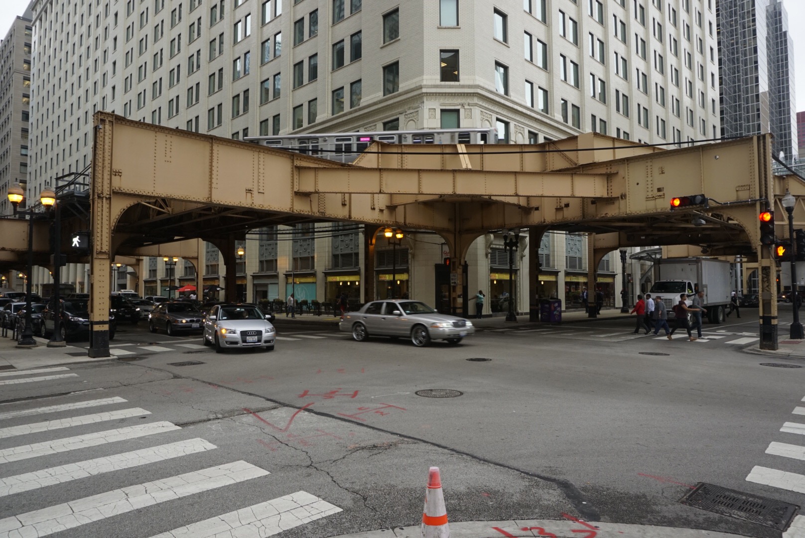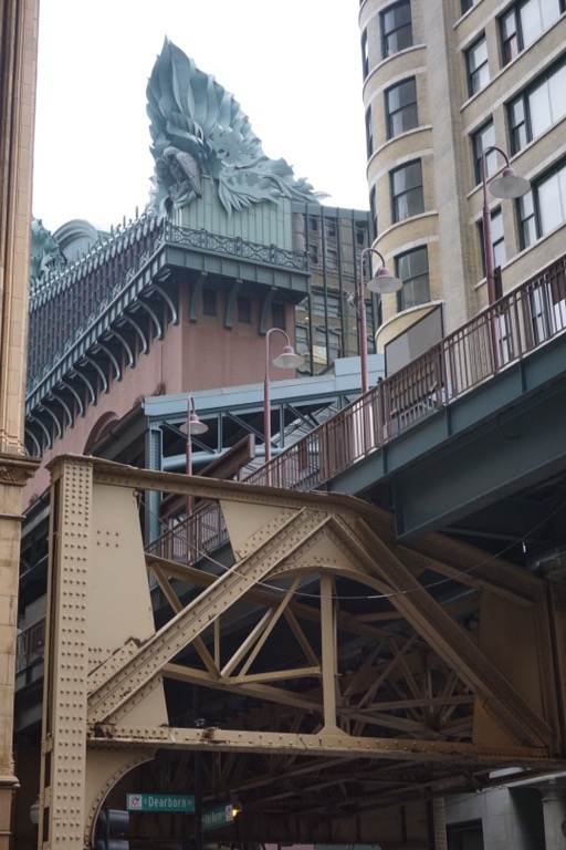 Der Rundparcours, kurz L oder L Train genannt, wurde als Hochbahn auf eigener Trasse über der Straße angelegt, um den damals chaotischen Verkehr anno 1892 in den Griff zu bekommen. Dieser ratternden, lauten, häßlichen und angeblich bisweilen unzuverlässigen Hochbahn wurde im Laufe der letzten Jahrzehnte immer wieder der Abriss angedroht. Aber mittlerweile wurde sie wohl in den Status der Unsterblichkeit gehievt. Heute fahren fünf Linien auf jeweils rund 1,5 km Länge rund um die Innenstadt, wobei jede von ihnen an einer Stelle aus dem Ring aussteigt und in eine jeweils andere Himmelsrichtung abzweigt. Beeindruckt hat mich, wie eng die L sich an manchen Stellen an die Häuser schmiegt und wie stark sie die Innenstadt dominiert. Fast wie eine Stadtmauer :-).