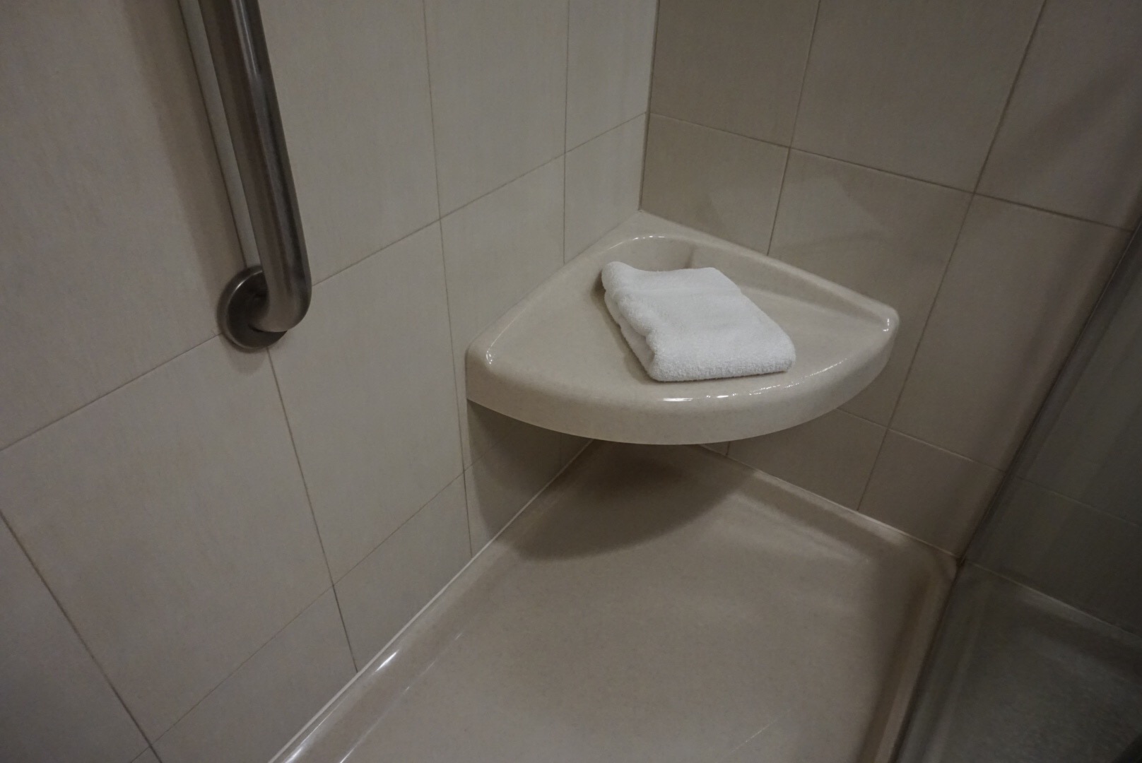 In diesem Hotel denkt man mit und kalkuliert ein, dass manche Gäste durchaus auch mal eine Pause beim Duschen brauchen oder generell im Sitzen duschen.