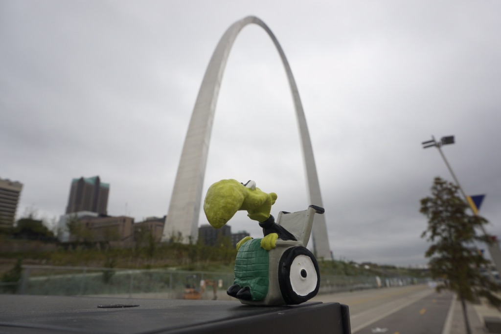 Bewundere ich dann halt schon mal das Tor zum Westen. Der Grüne sucht sich derweil eine passende Bühne, um sich angemessen in Szene zu setzen. Er wird immer mehr zur Rampensau! Was er zu diesem Zeitpunkt noch nicht weiß: der versprochene Stunt vom Arch runter mit Beweisfotos wird nicht stattfinden. Er kommt einfach nicht an die Außenseite ran! Sorry, Verena …