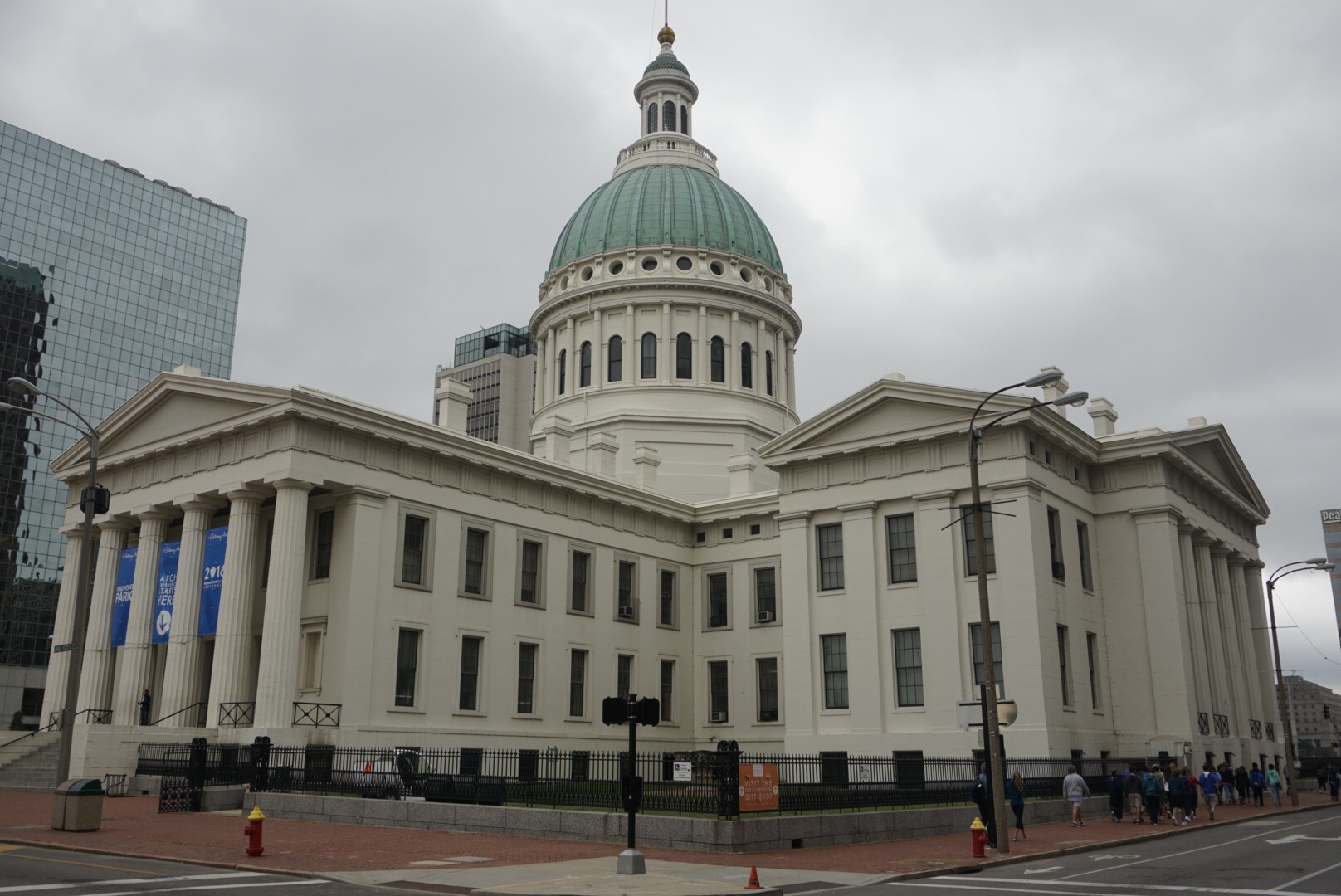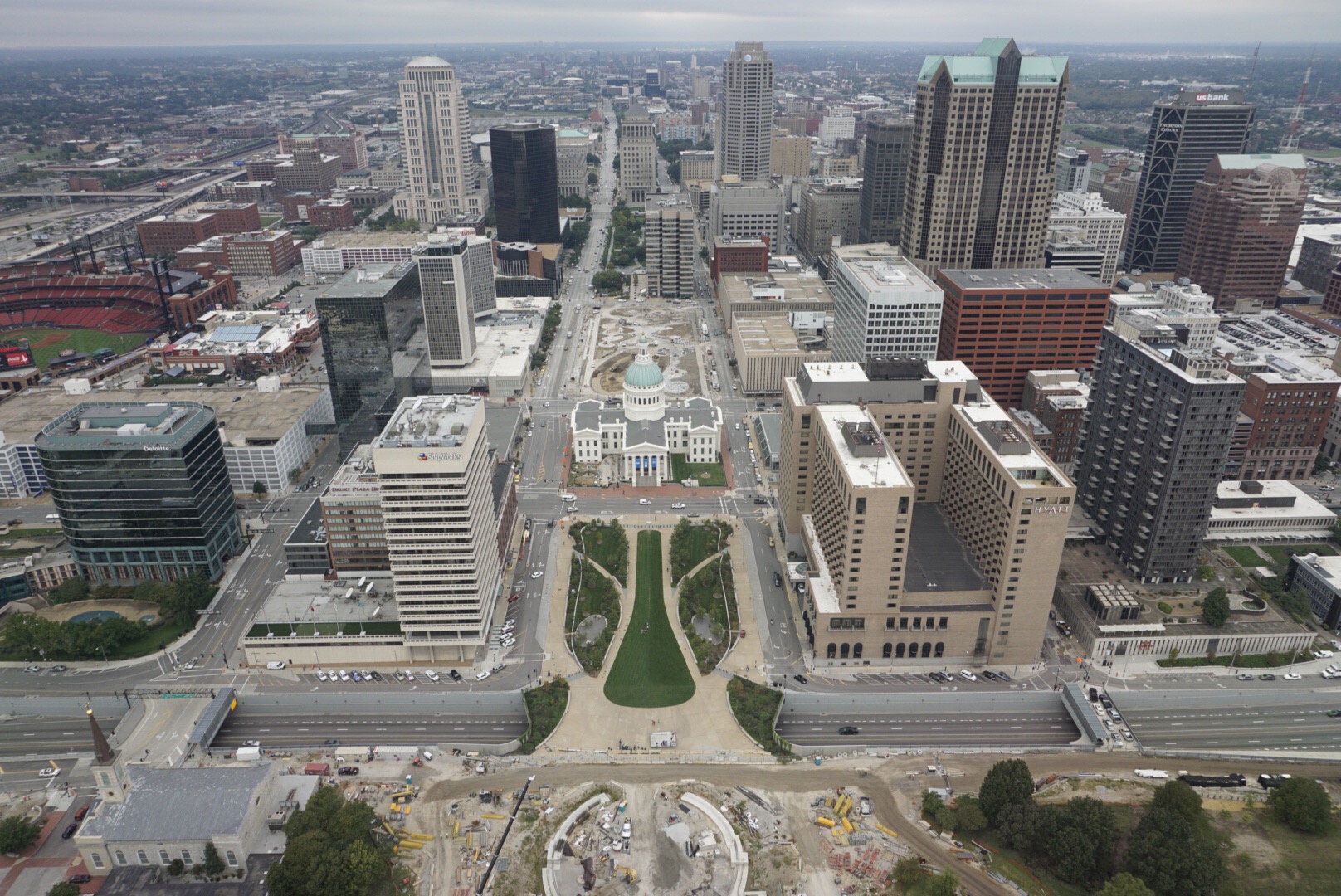 … und die wirklich grandiose Aussicht genießen. Einmal auf die Innenstadt mit dem Old Courthouse  (Missouri-Seite) und dann noch auf East St. Louis jenseits des Mississippi auf der Illinois-Seite. Der Trip da hoch hat sich echt gelohnt!