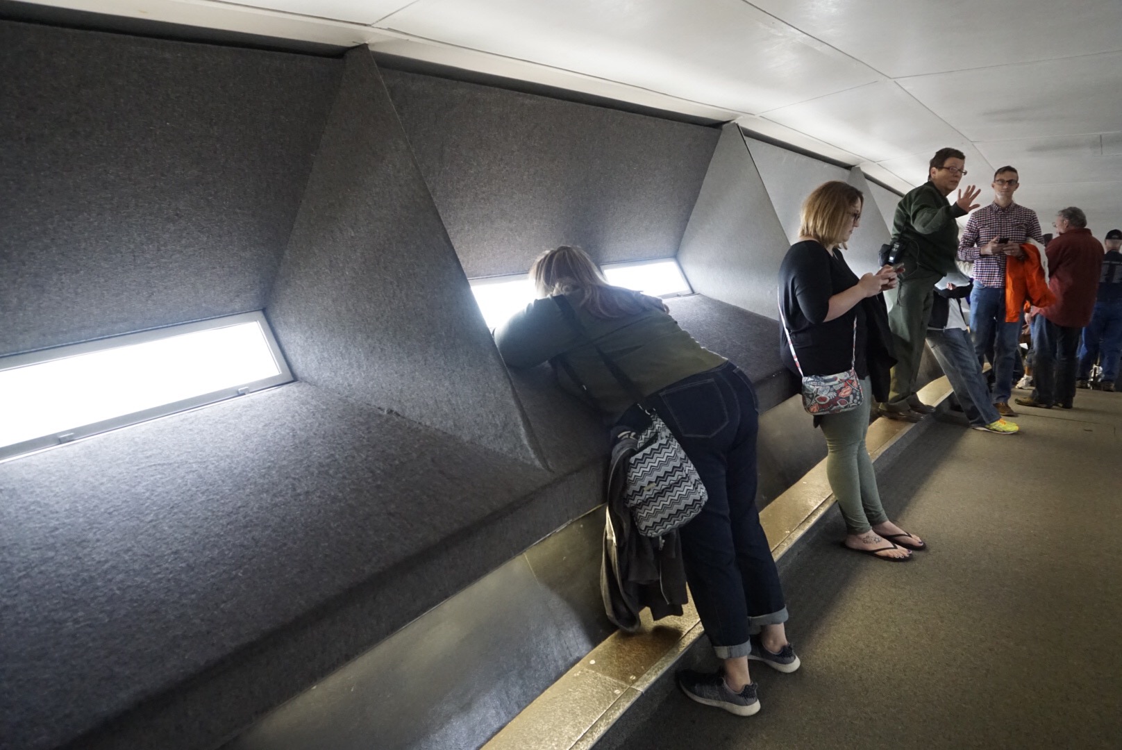 Ich habe Glück und komme ohne Wartezeit hinein und rauf. Der frühe Vogel fängt den Wurm :-). Die wartende Menge steht vor dem sehr speziellen Aufzug und wartet, dass sich die Türen öffnen.