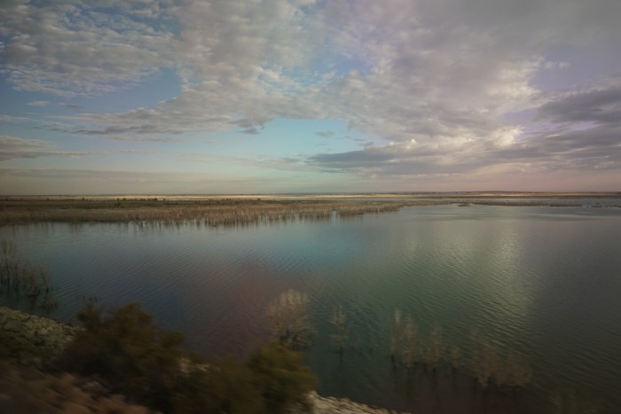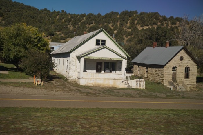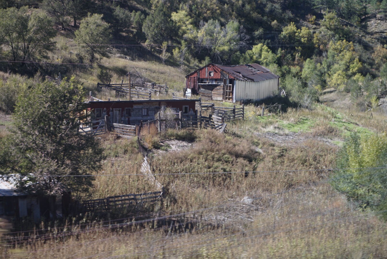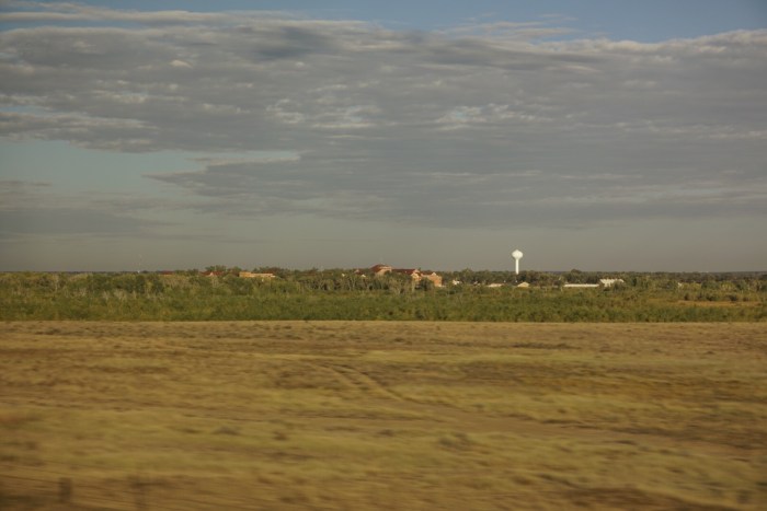 Zurück in meiner Luxusbehausung, mache ich es mir auf meinem Sitz bequem und genieße die Landschaft. Erst ist es flach und steppig, dann kommen zarte Hügelchen dazu, niedriges Buschwerk, ab und an eine Wasserpfütze, in der Ferne einzelne versprengte Häuser und Farmen. Kühe. Autofriedhöfe. Zwischendurch ein Knast. Und das eine oder andere Dörfchen.