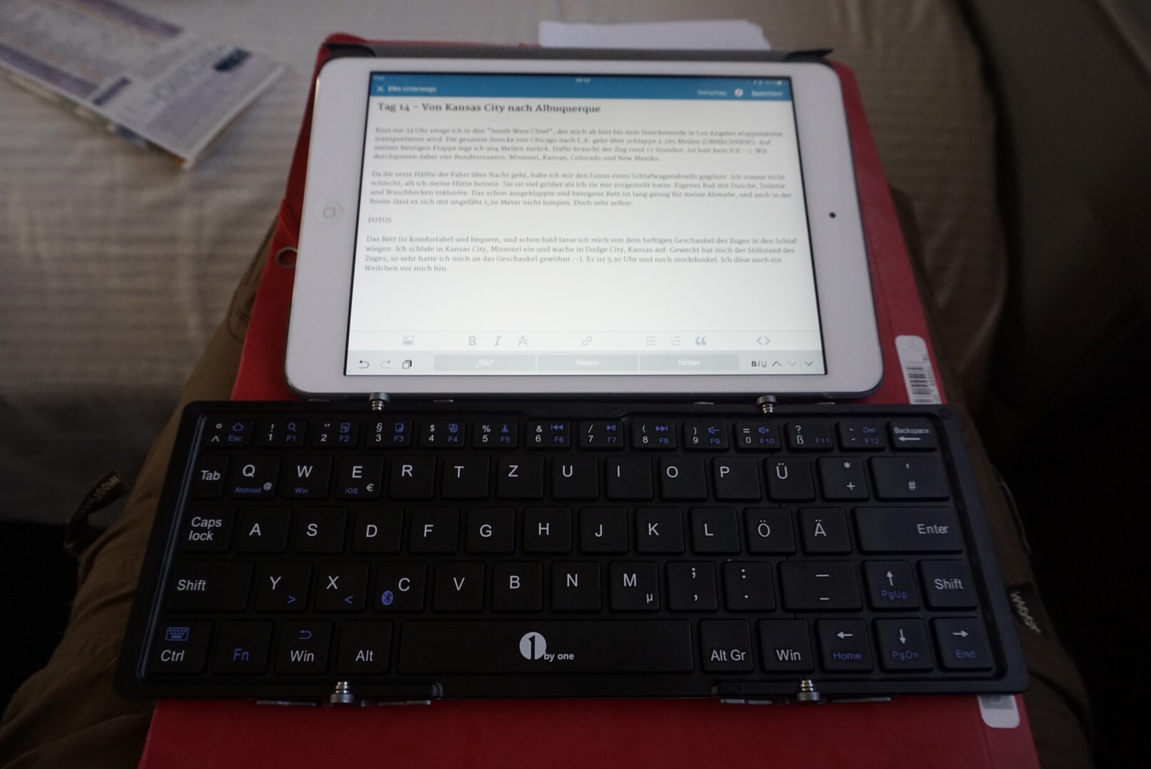 Zwischendurch nehme ich schon mal mein mobiles Office in Betrieb und beginne mit dem heutigen Blogbericht. Hoch lebe das iPad mini und die faltbare Tastatur.