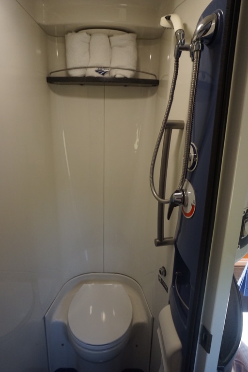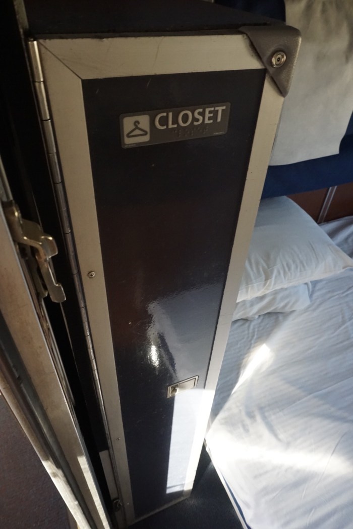 Da fast die erste Hälfte der Fahrt über Nacht geht, habe ich mir den Luxus eines Schlafwagenabteils gegönnt. Ich staune nicht schlecht, als ich meine Hütte betrete. Sie ist viel größer als ich sie mir vorgestellt hatte. Eigenes Bad mit Dusche, Toilette und Waschbecken inklusive. Sogar einen kleinen Kleiderschrank gibt es. Das schon ausgeklappte und bezogene Bett ist lang genug für meine Abmaße, und auch in der Breite lässt es sich mit ungefähr 1,30 Meter nicht lumpen. Hereinspaziert in die gute Stube!