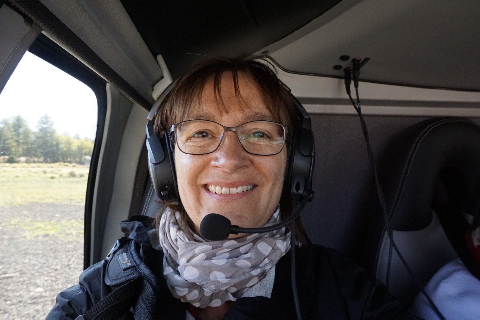 Insgesamt passen sieben Personen in so einen Hubschrauber rein. Vorne beim Piloten (bzw. in unserem Fall bei der Pilotin) sitzen zwei Leute und hinten vier. Ich habe Glück und bekomme einen Fensterplatz. Elki ist bereit zum Abflug!