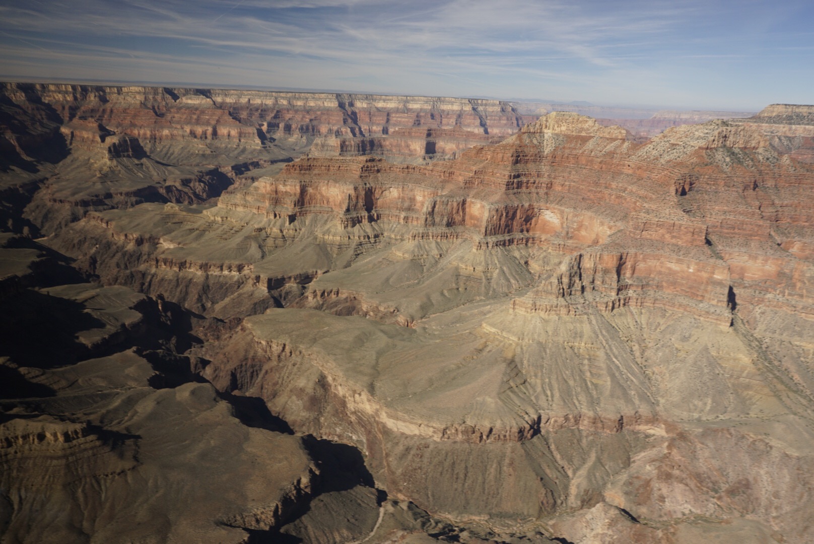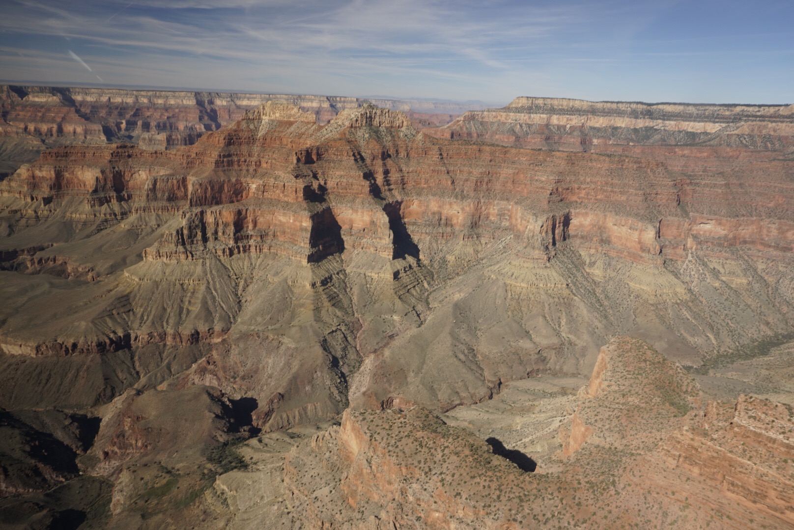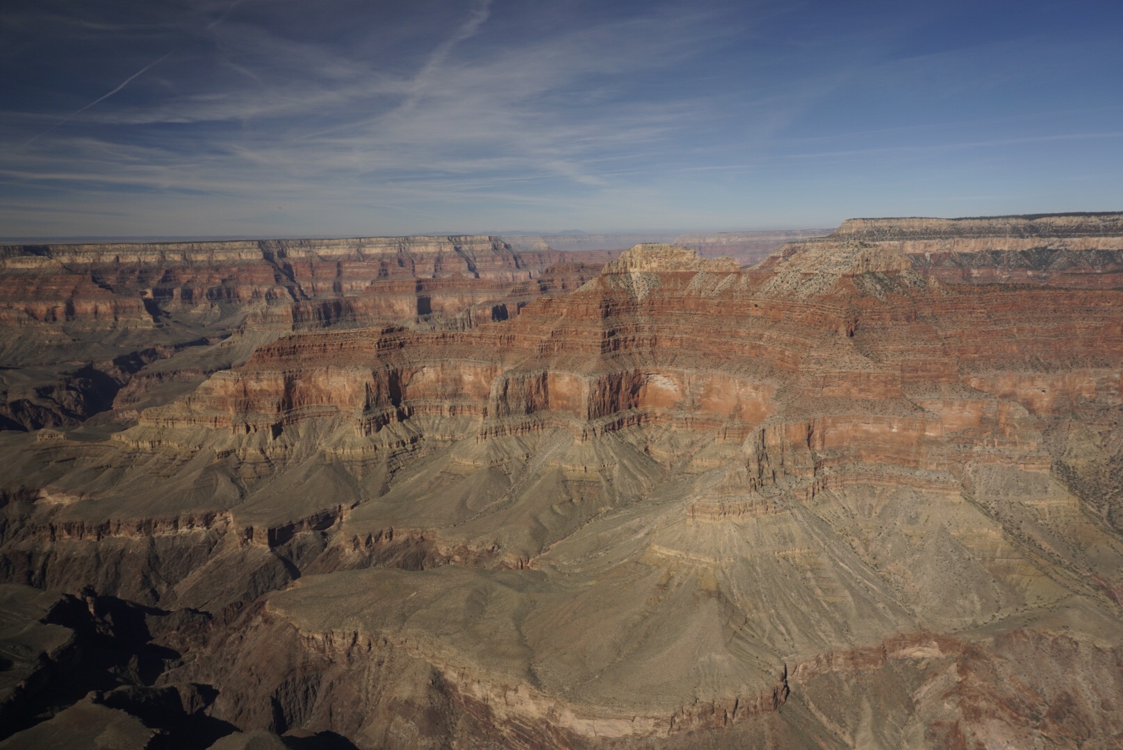 Und dann verschlägt es mir die Sprache. Der Canyon ist ja schon atemberaubend, wenn man ihn oben vom Rim aus betrachtet. Was das Teil aber aus der Luft zu bieten hat, toppt alles. Vor lauter Staunen mit heruntergeklappter Kinnlade vergesse ich fast, meine Kamera zu zücken. Aber keine Sorge, das kriege ich noch rechtzeitig in den Griff. Der Himmel ist heute gnädig und schenkt uns ein paar Streifen. Sieht auf Fotos und auch in echt dann noch schöner aus als vor unifarbenem Blau, gell, Stefan? Und nun nehmt das: