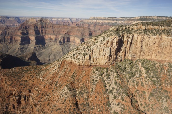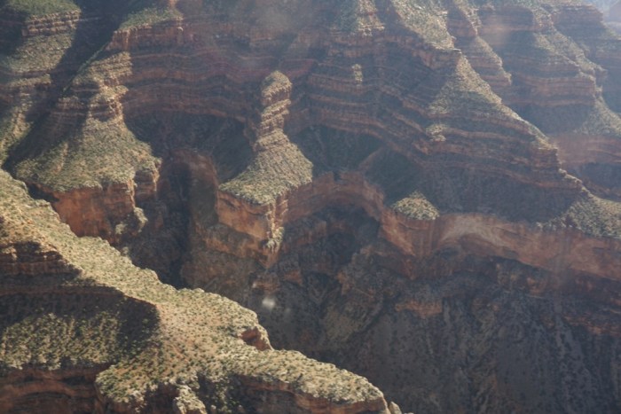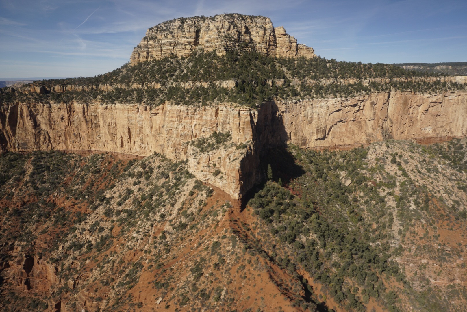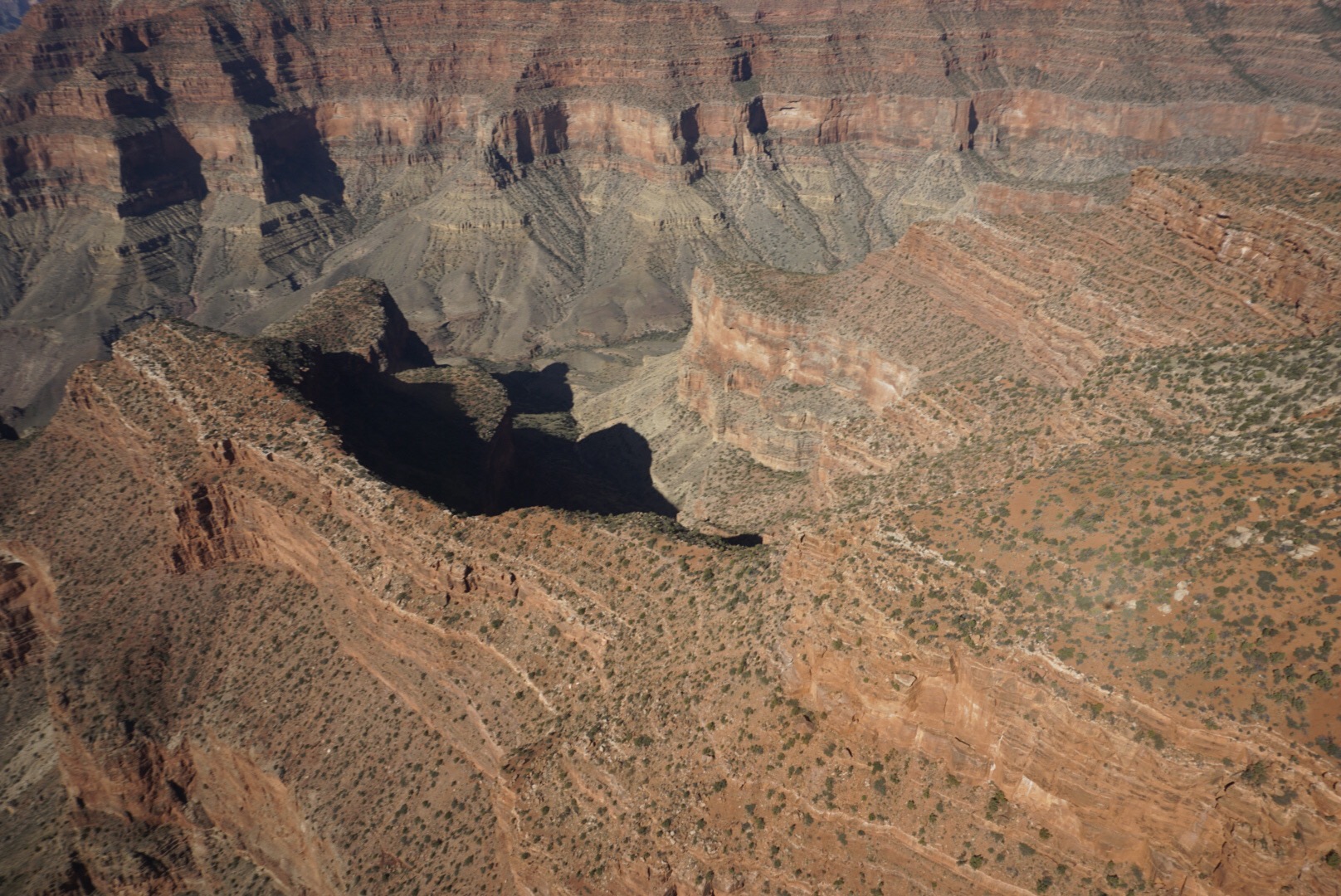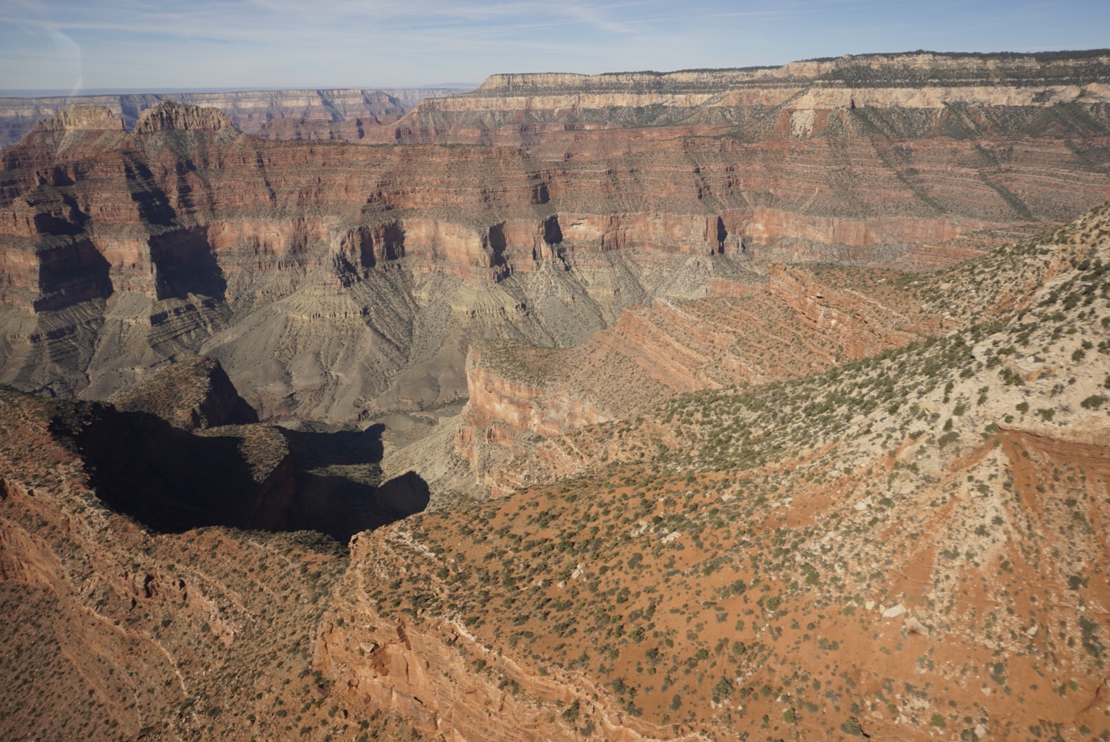 Und dann verschlägt es mir die Sprache. Der Canyon ist ja schon atemberaubend, wenn man ihn oben vom Rim aus betrachtet. Was das Teil aber aus der Luft zu bieten hat, toppt alles. Vor lauter Staunen mit heruntergeklappter Kinnlade vergesse ich fast, meine Kamera zu zücken. Aber keine Sorge, das kriege ich noch rechtzeitig in den Griff. Der Himmel ist heute gnädig und schenkt uns ein paar Streifen. Sieht auf Fotos und auch in echt dann noch schöner aus als vor unifarbenem Blau, gell, Stefan? Und nun nehmt das: