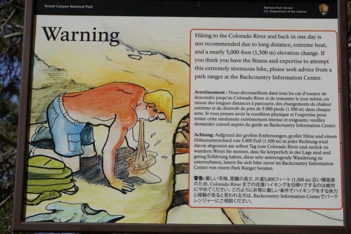 Jedes Jahr müssen hunderte Wanderer aus dem Canyon gerettet werden. Es gibt jährlich auch zahlreiche Todesfälle. Das liegt nicht daran, dass es generell zu gefährlich ist, hier zu wandern. Auch sind die Wege breit genug und – zumindest im trockenen Zustand – gut begehbar. Die meisten Wanderer scheitern an sich selbst: zu wenig gegessen, zu wenig Wasser dabei, keine Kopfbedeckung, Sonnenstich, Kreislaufkollaps wegen zu wenigen Pausen oder zu schnellem Tempo, abgerutscht wegen falschem Schuhwerk (auch Flipflops wurden schon gesichtet…), die eigene Kondition und körperliche Belastbarkeit überschätzt, den Weg unterschätzt etc. Wer meint, den Kaibab an einem Tag runter und wieder rauf laufen zu können, hat schlichtweg einen an der Waffel. Es sind zwar „nur“ zehn Kilometer vom Rim bis runter an den Colorado River, aber dazwischen liegen 1.500 Höhenmeter, was für den Rückweg ein echter Brocken ist. Auf entsprechend drastische Weise wird deshalb gewarnt, zum Beispiel so: