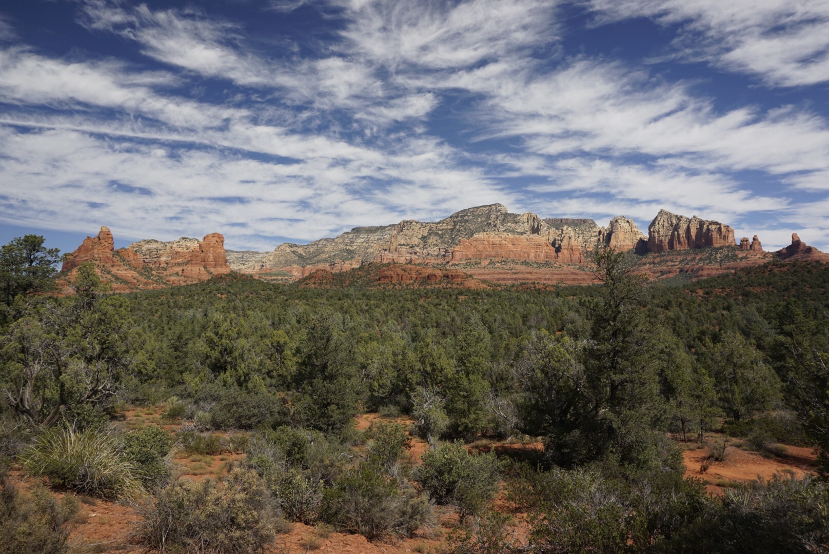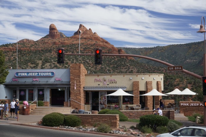 Um kurz nach halb neun landen wir in Sedona. Um diese Uhrzeit ist es noch himmlisch ruhig, danach bricht die Tourihölle aus, wie von unserem Chauffeur (hört sich das nicht viel besser an als Fahrer?!?) prophezeit. Sedona besteht im wesentlichen aus einer langen Durchgangsstraße, was euch so langsam nicht mehr wundern sollte. Aber die Lage ist wahrlich spektakulär: