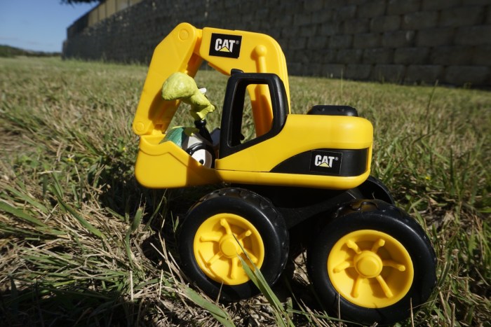 Doch Kevin und der Alte Sack haben anderes im Sinn. Da die Enten unser mitgebrachtes Brot verschmähen und sich ans andere Ende des Teiches verziehen – wer weiß, welche Delikatessen ihnen heute schon vorgesetzt wurden -, wollen sie lieber wieder nach Hause ins kühle Trockene. Doch bevor wir uns auf den Rückweg machen, überredet der Alte Sack Kevin dazu, ihm seinen Bagger auszuleihen. Der ist dann auch so nett und rückt das gute Stück raus.