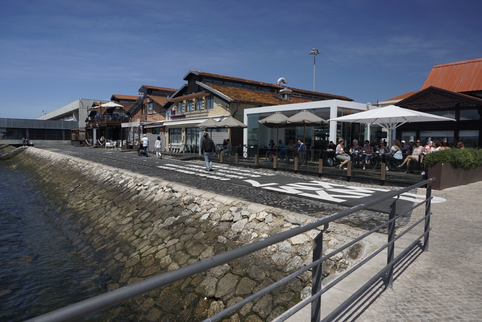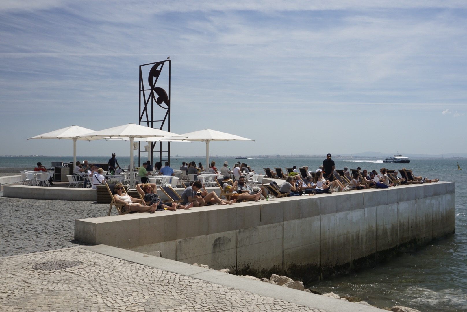 Rüber auf die andere Straßenseite, quer durch den Bahnhof durch, und schon lande ich an der Uferpromenade des Téjo. Hier wird bei angenehmen 25 Grad schon ordentlich gegessen, getrunken, flaniert und gechillt, was das Zeug hält.
