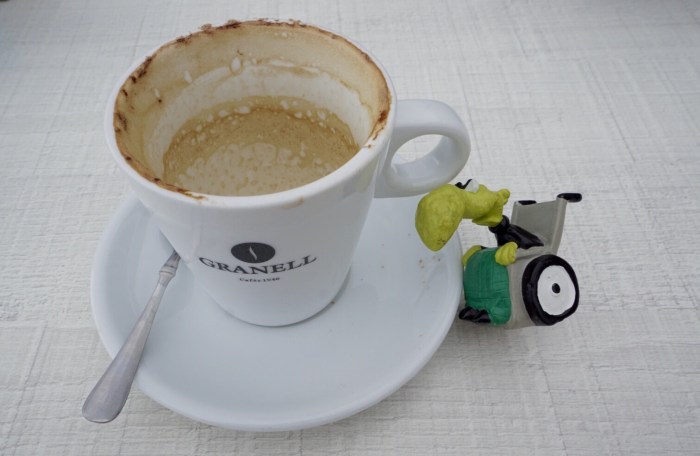 … aber wir widerstehen und laufen noch ein ganzes Stückchen weiter. Bis uns dann doch ein lauschiges Plätzchen dazu verführt, innezuhalten und warme Flüssigkeiten in unsere Münder zu kippen. Jetzt ist auch der Moment gekommen, in dem mein kleiner, grüner Reisebegleiter endlich seine Akklimatisierung abgeschlossen hat und sich an die Öffentlichkeit wagt.