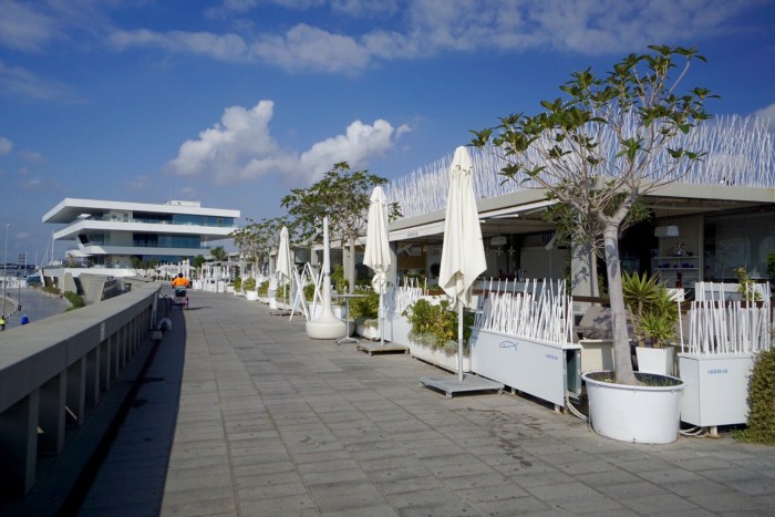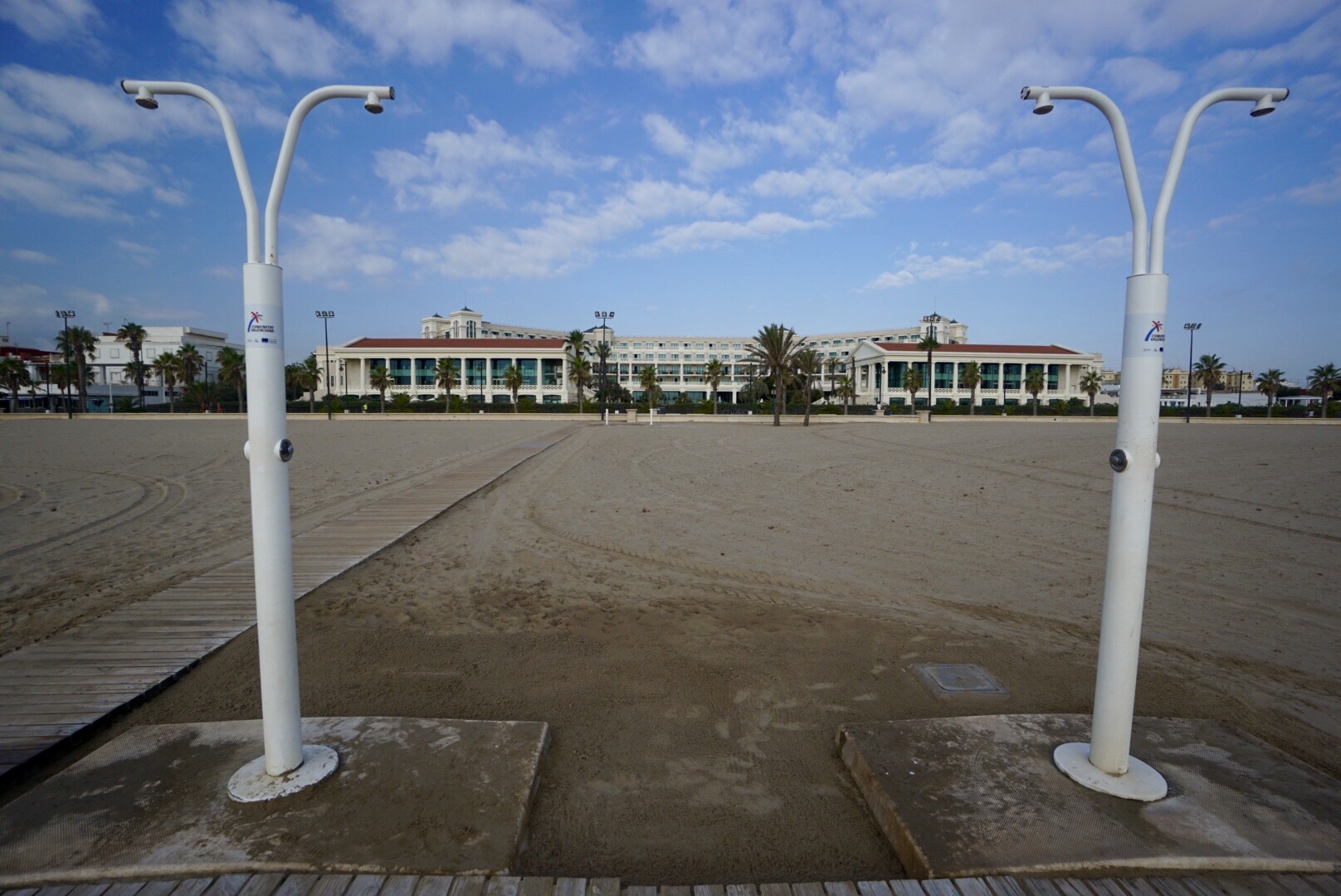 Heute wollen wir Meer. Keinesfalls weniger. Der Alte Sack genießt es, mich wenigstens für eine Weile nicht mit Stefan teilen zu müssen. Denn der hat morgens ein Rendezvous mit dem schicken Chipperfield-Bau am Hafen. Langzeitfotografie braucht Wölkchen, und die lassen sich heute morgen endlich blicken. So genießen wir nach dem obligatorischen Käffchen in einer der Bars an der Promenade den kleinen Strandspaziergang zu zweit.