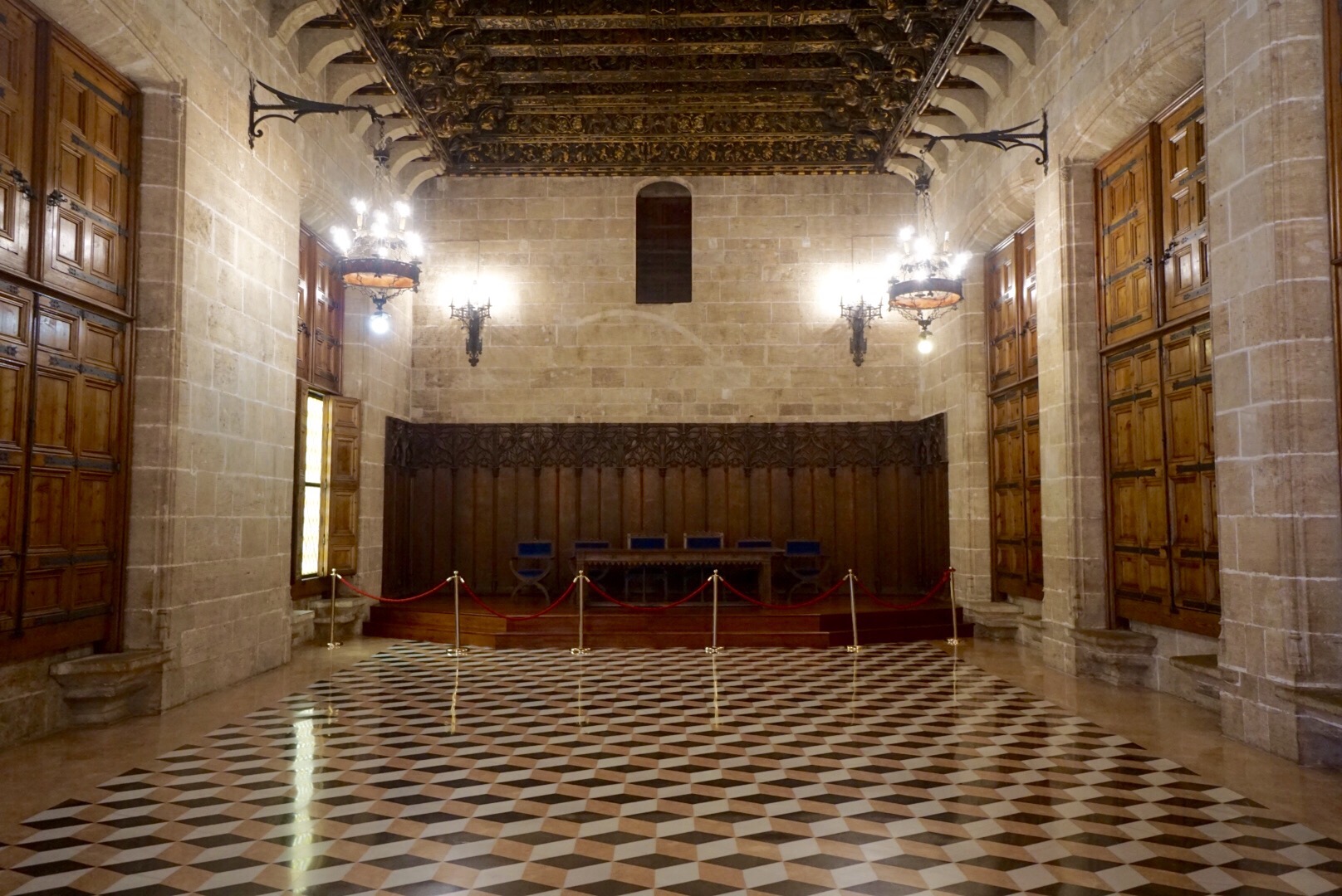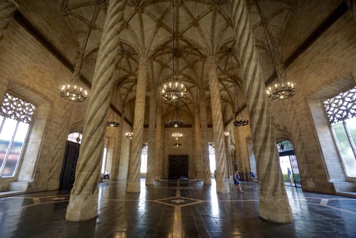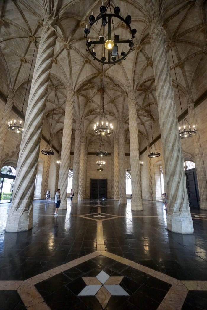 … schlendern wir unserem nächsten Ziel entgegen, das wir bisher links liegen gelassen haben: La Lonja, die ehemalige Handelsbörse. Die große Säulenhalle vermittelt uns zwar das Gefühl, in einer Kathedrale zu stehen, aber gehuldigt wurde hier nicht den Göttern, sondern dem Kommerz. La Lonja war der Dreh- und Angelpunkt für den florierenden Seidenhandel im 15. Jahrhundert. Schaut euch mal dieses Schmuckstück an: