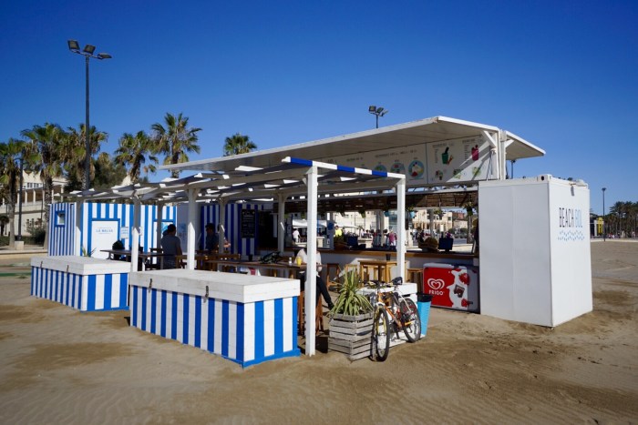 Am heutigen Sonntag bleibt unser Bewegungsradius überschaubar. Während Stefan es sich morgens in der Wohnung gemütlich macht, begebe ich mich auf die Jagd nach einem Kaffee in Richtung Meer. In dieser Strandbar …