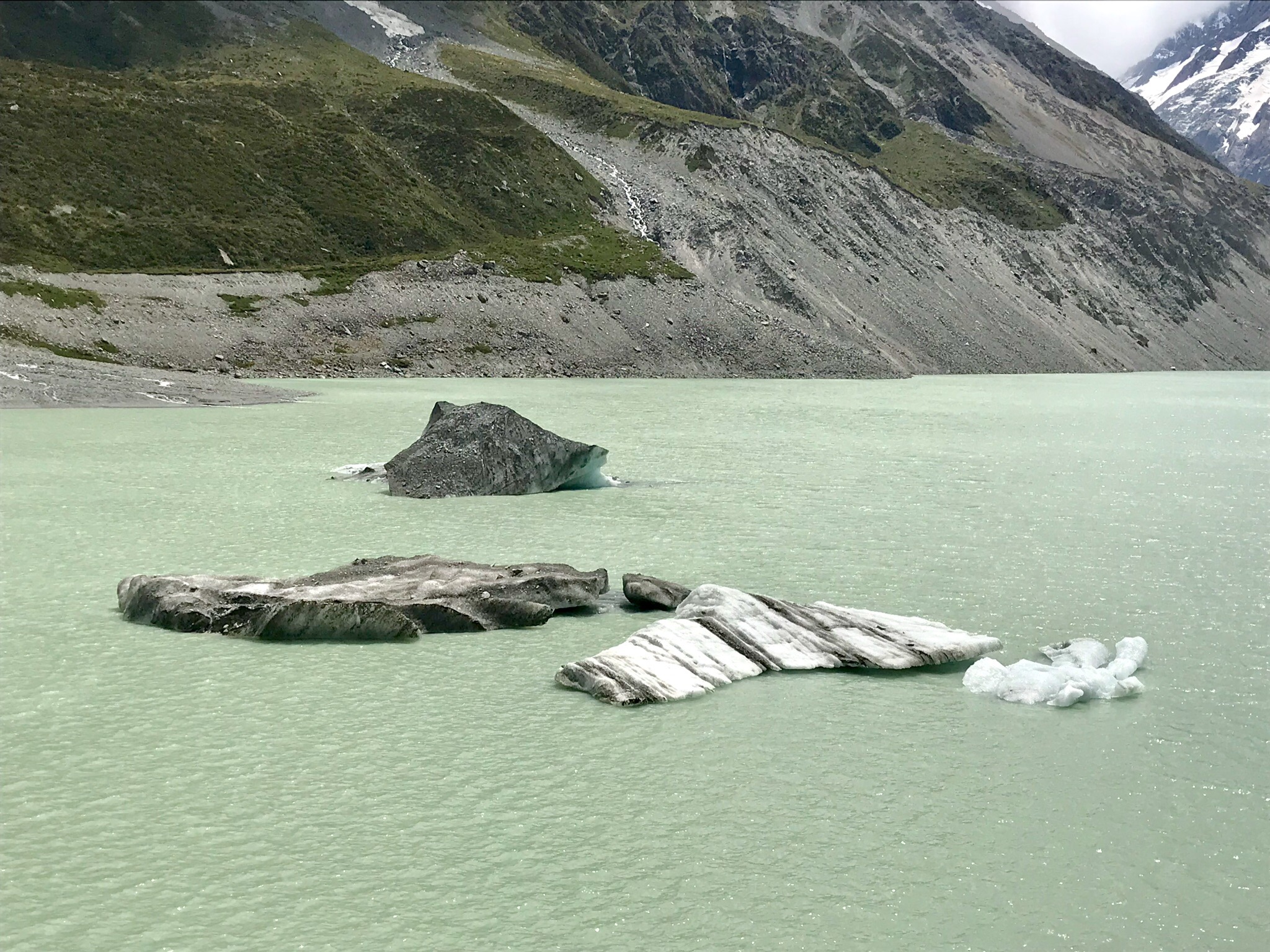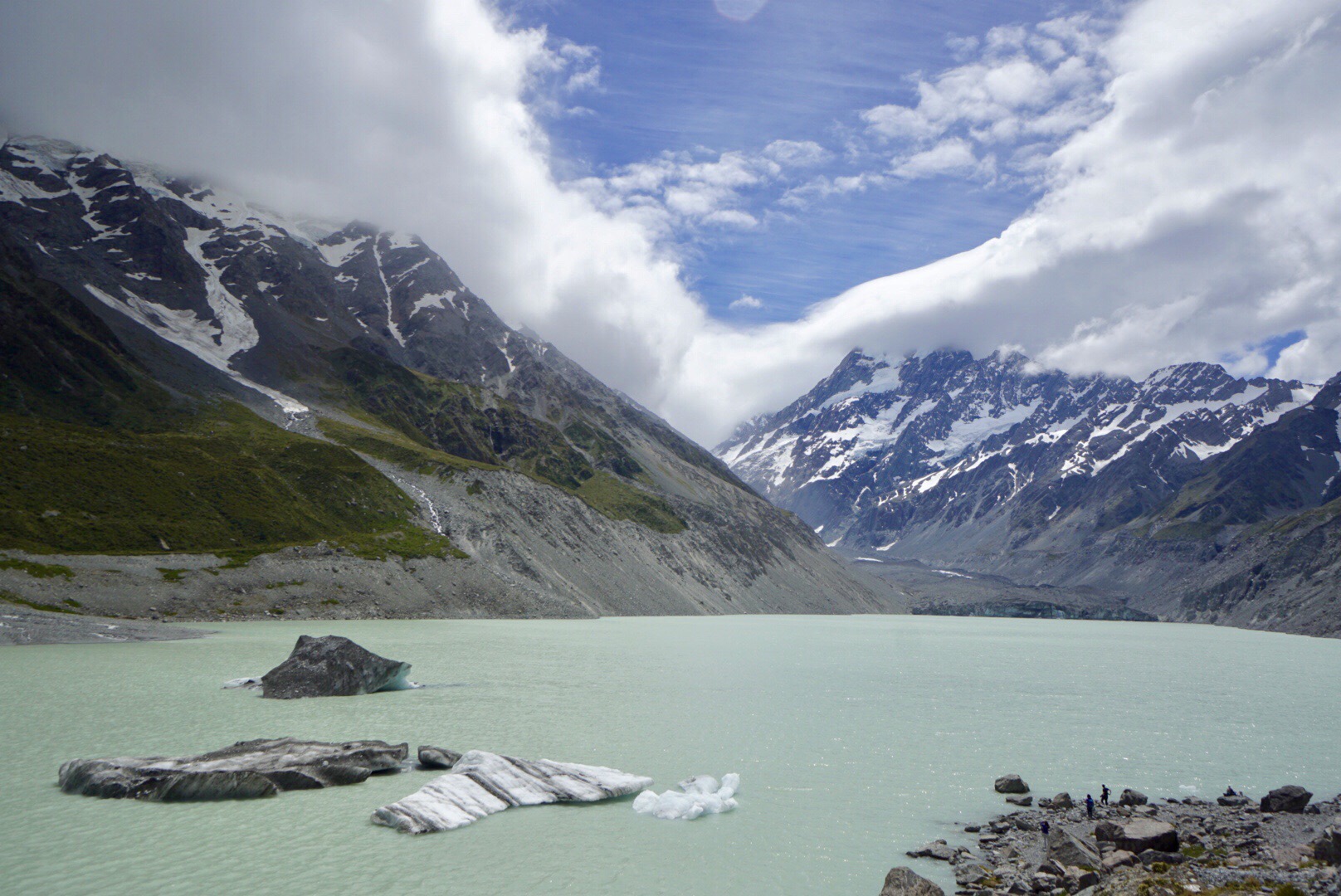 Und dann ist der Hinweg geschafft. Er endet an einem kleinen Gletschersee, in den sich kunstvoll geformte Eiskreationen gestürzt haben (siehe auch das heutige Titelbild). Der Mount Cook ist auf dem zweiten und vierten Foto rechts oben zu sehen. Es ist der mit den vielen Schneestellen. Für seine Verhältnisse zeigt sich der 3.724 Meter hohe Koloss heute recht offenherzig.
