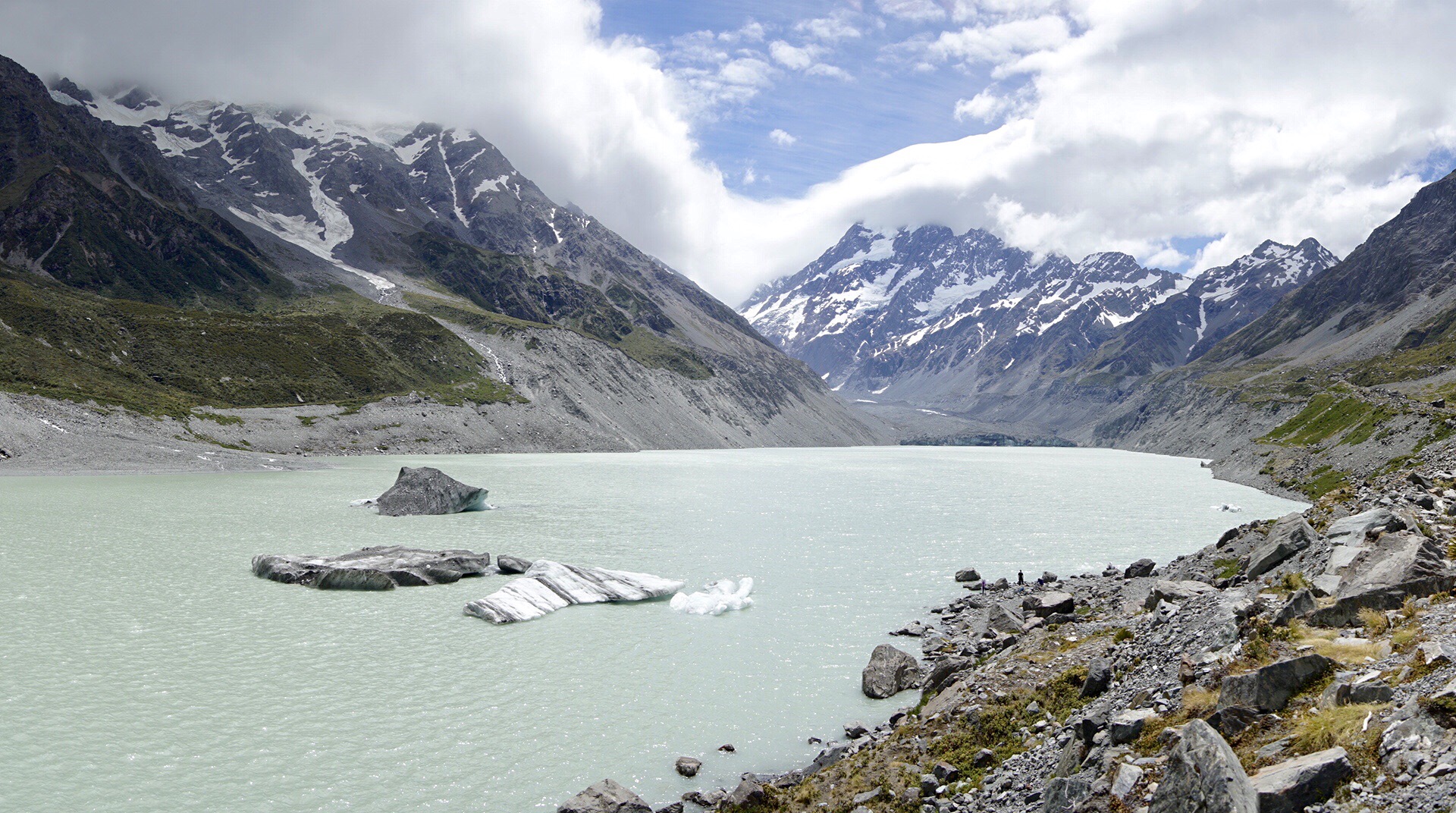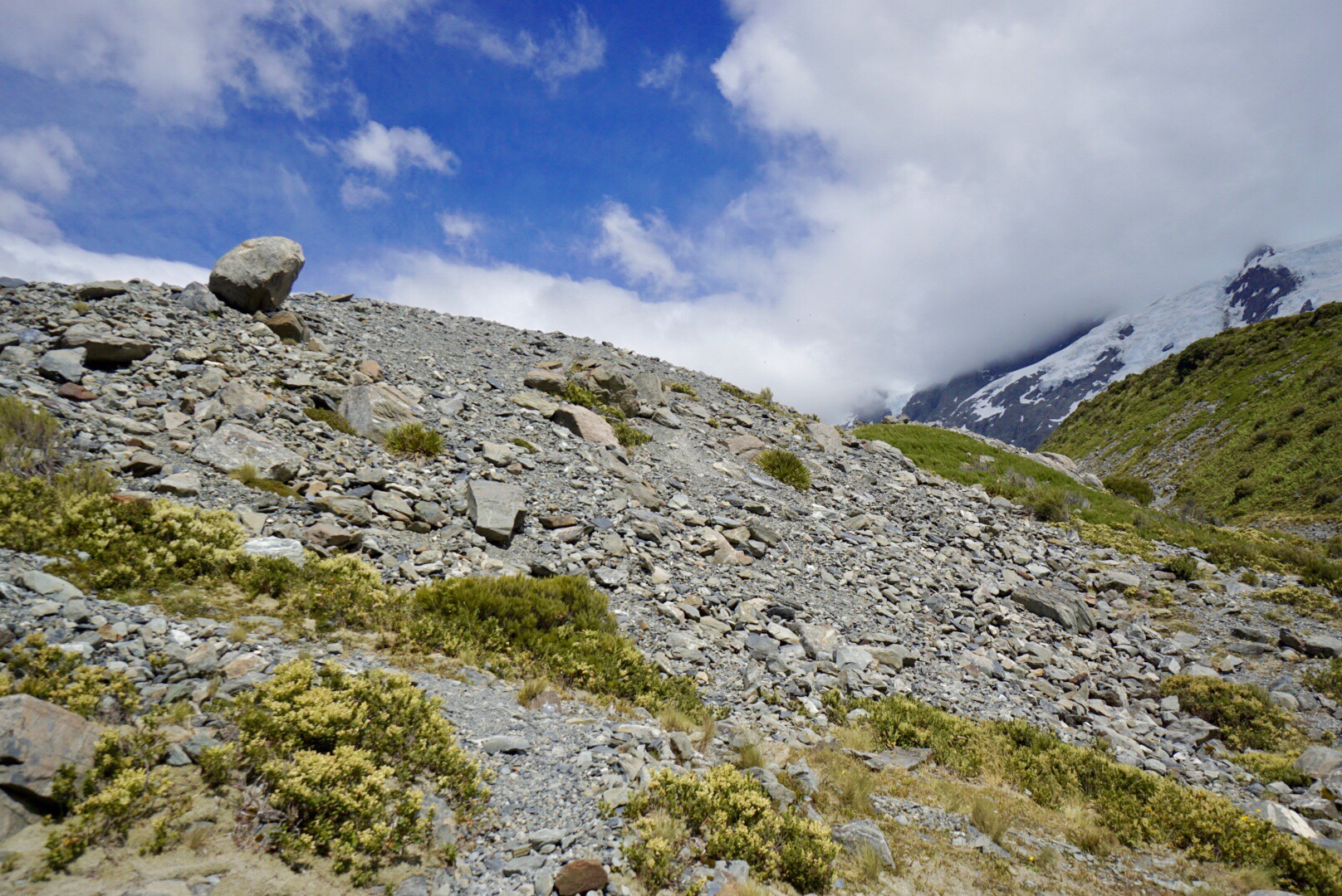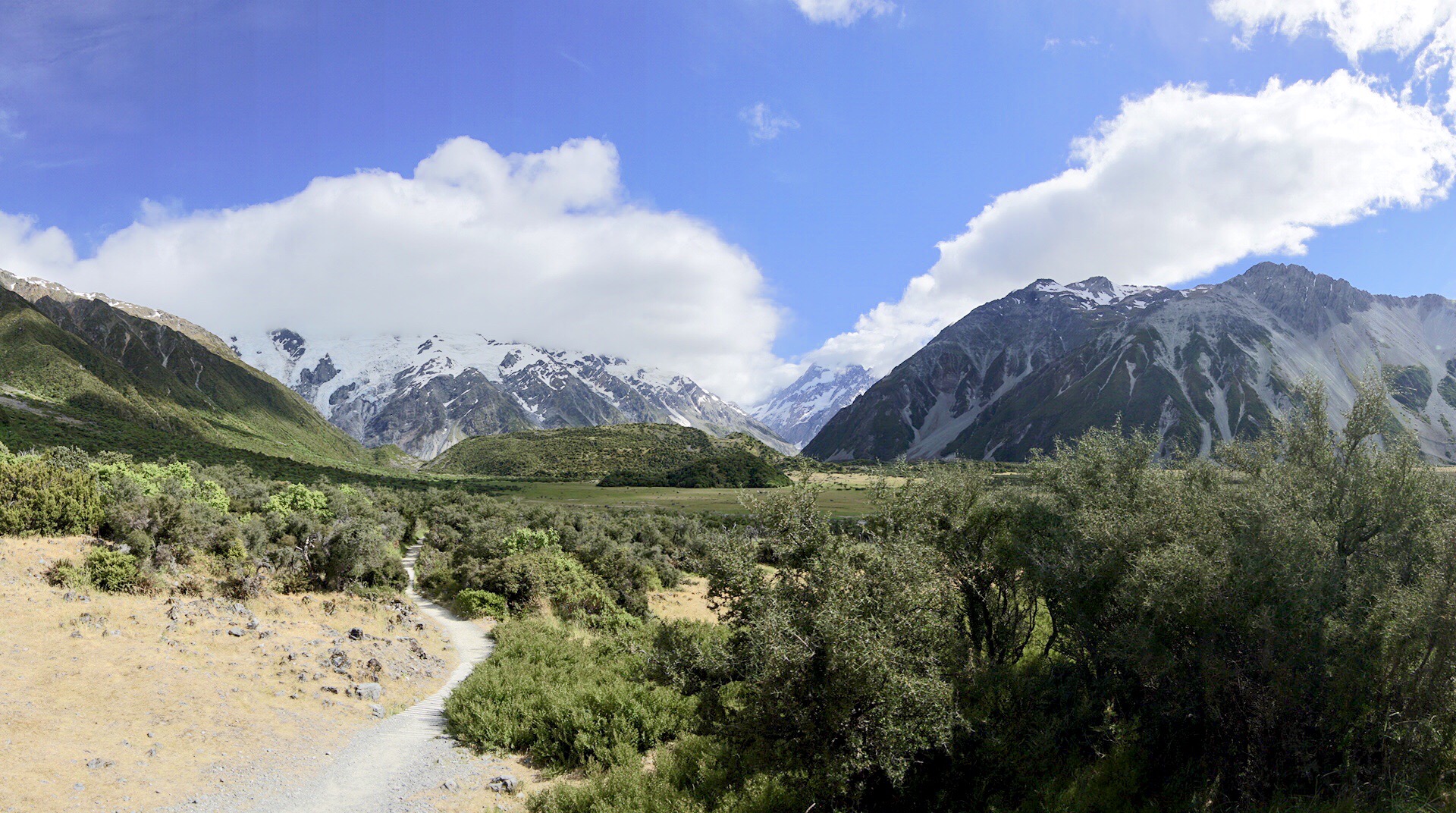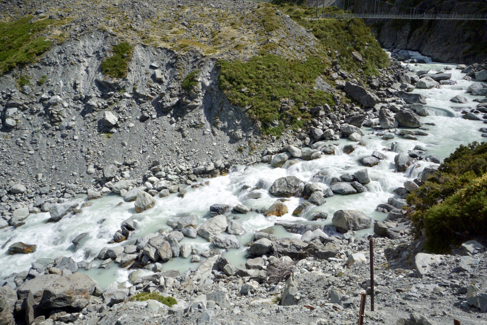 Nach rund eineinhalb Stunden erreichen wir das Mount Cook Valley, das quasi als „Basiscamp“ für die zahlreichen hier startenden Wanderwege dient. Da ich wegen des frühen Startes heute morgen noch nicht gefrühstückt habe, mache ich mich erst mal im Restaurant des Hotels The Hermitage breit. Mit gut gefülltem Magen mache ich mich anschließend auf den Weg. Ich habe mich für den geriatrisch einfachen Hooker Valley Track entschieden, der, wie der Name schon sagt, durch ein Tal führt und somit kaum Höhenmeter aufzuweisen hat. Man läuft etwa drei bis vier Stunden hin und zurück, je nach persönlicher Geschwindigkeit und Fotografierintensität.