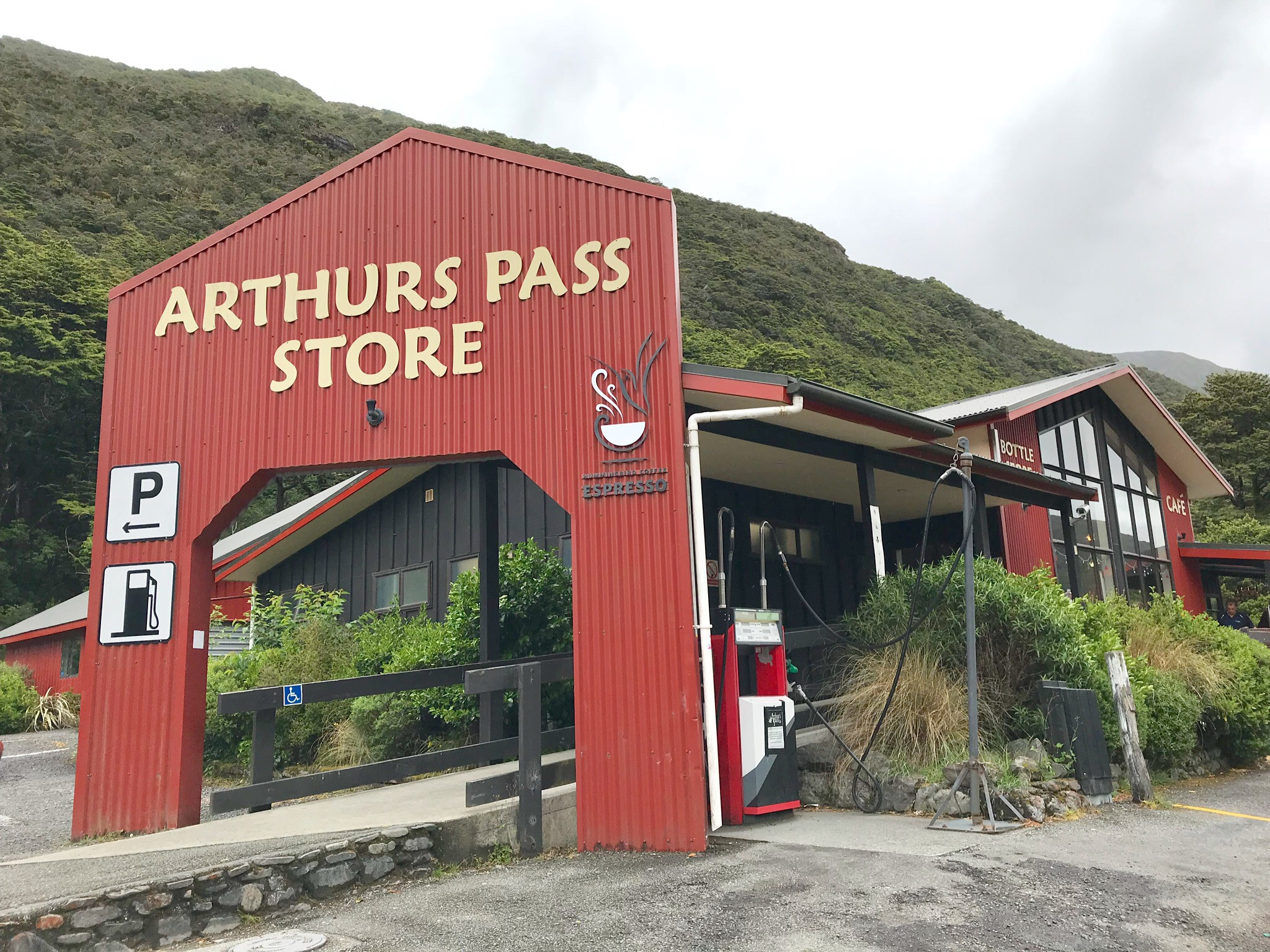 Der Scheitelpunkt, also die höchste Stelle der Strecke, ab der es in beide Richtungen wieder abwärts geht, liegt am Arthur’s Pass Village, wo wir eine kleine Pause einlegen. Als ich aus dem Bus aussteige, fängt es heftig an zu regnen, so dass ich die Zeit bis zur Weiterfahrt in diesem heimeligen Etablissement verbringe.