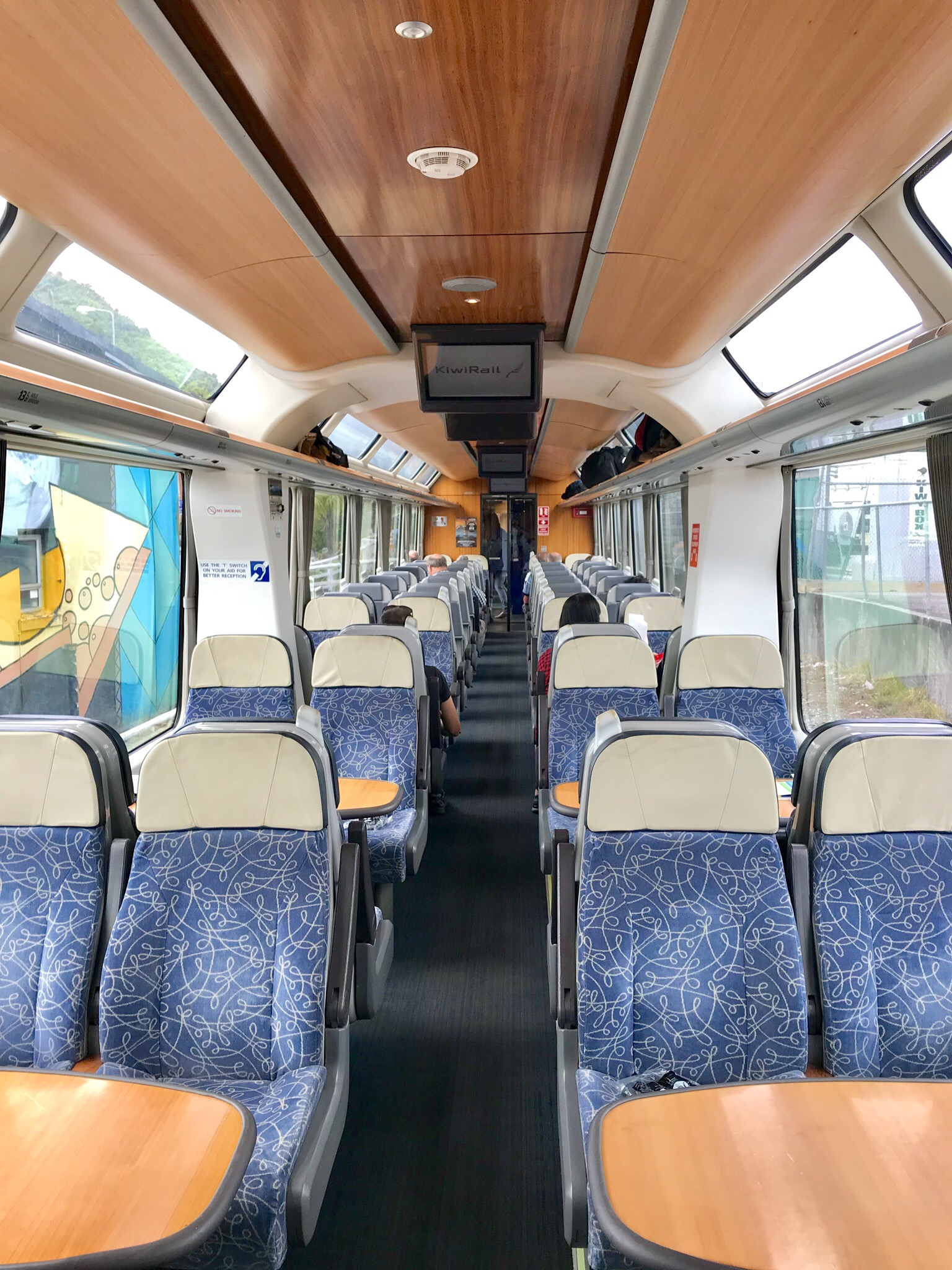 Zurück zum Bahnhof, wo der berühmte TranzAlpine schon auf mich wartet. Die Lok ist älteren Semesters (siehe Titelbild), aber die Passagierwaggons sind neu, modern und komfortabel.