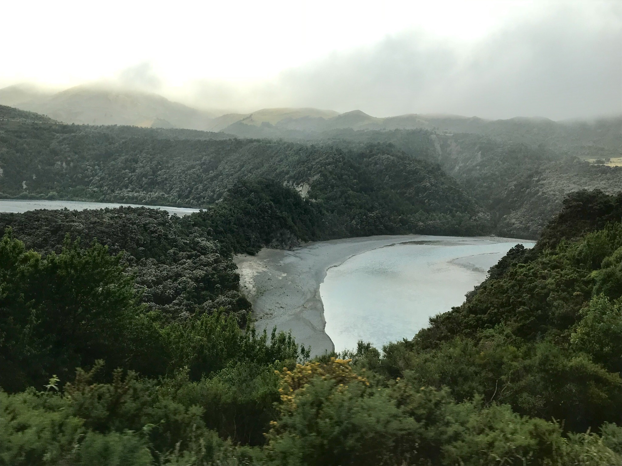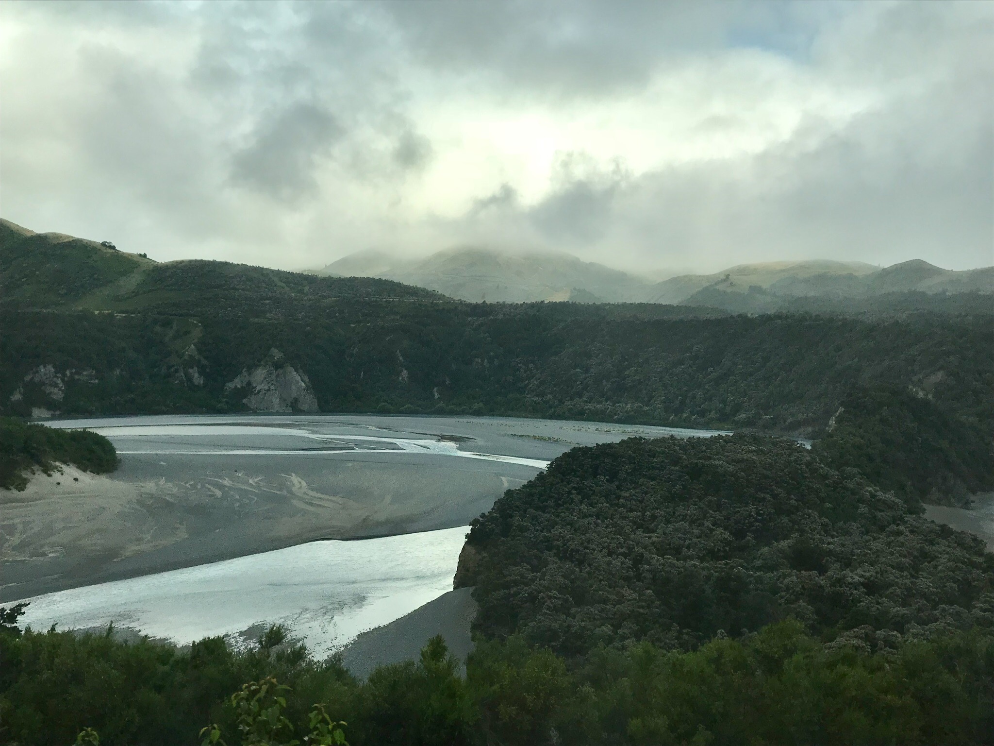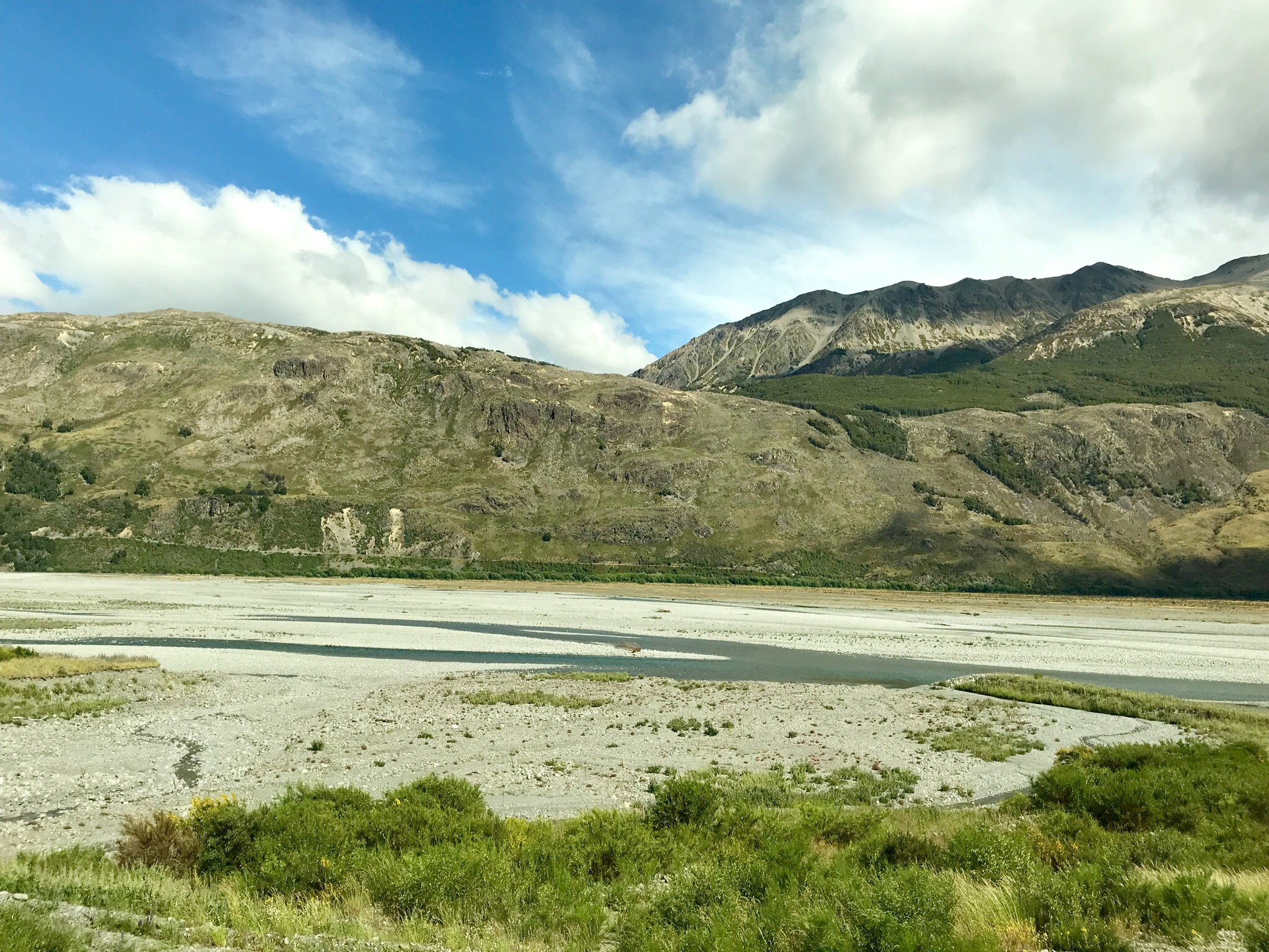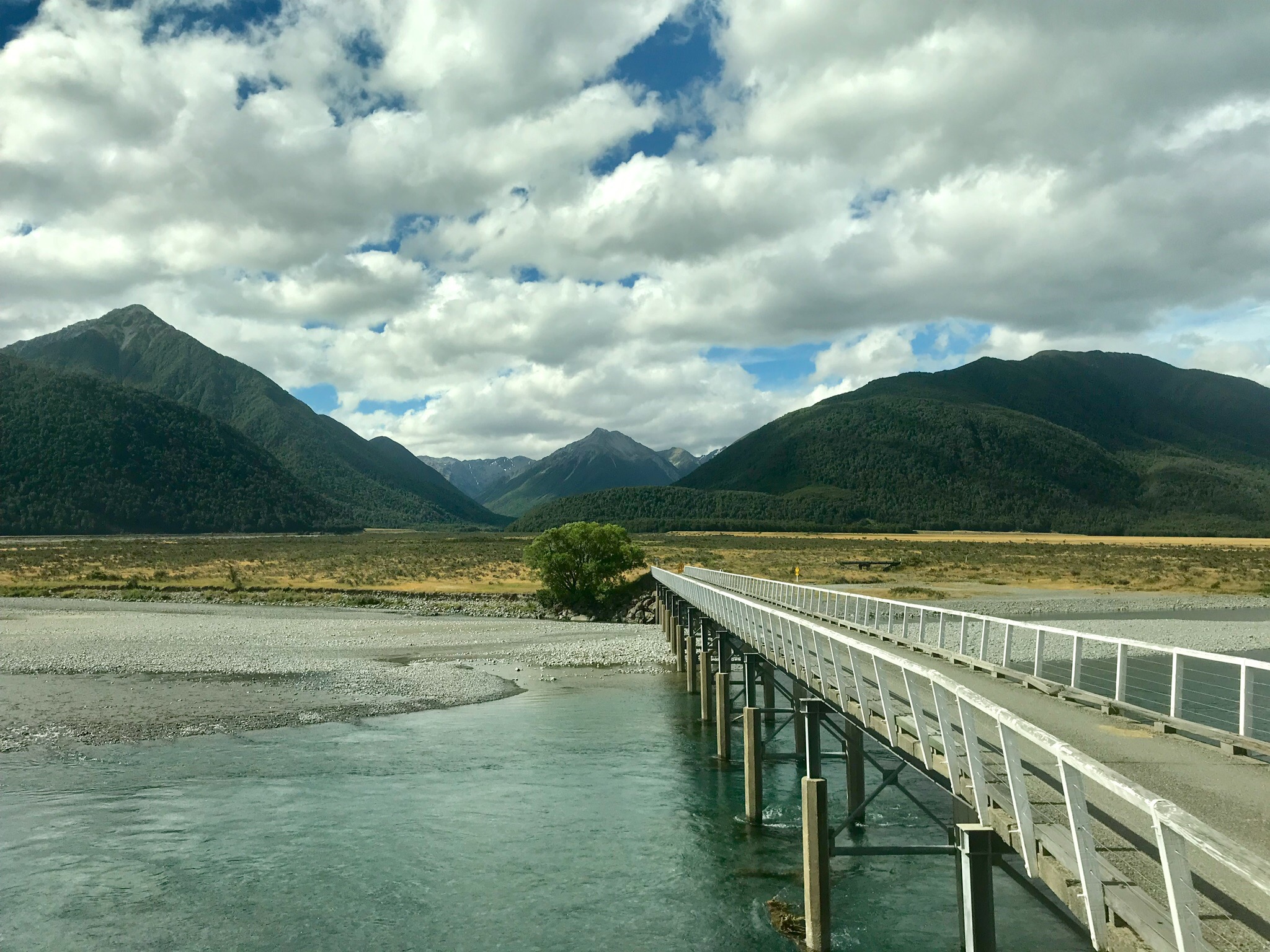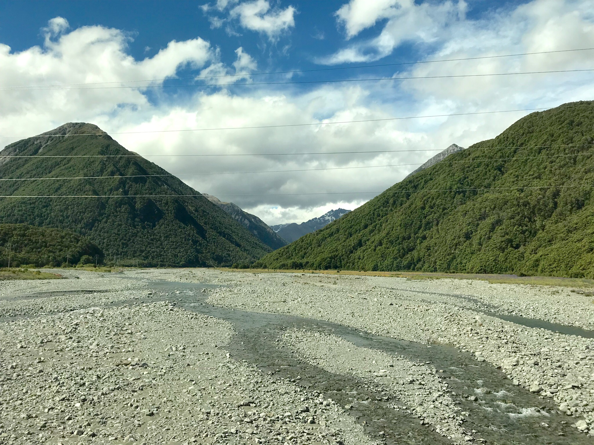 Zusammen mit fünf weiteren Fahrgästen starten wir im Kleinbus Richtung Greymouth. Die alpine Strecke bis zur Westküste erfüllt heute das viel zitierte Klischee, dass es in diesem Gebiet vier Jahreszeiten gibt – an einem Tag wohlgemerkt. Der Schönheit der Landschaft tut dies keinen Abbruch.