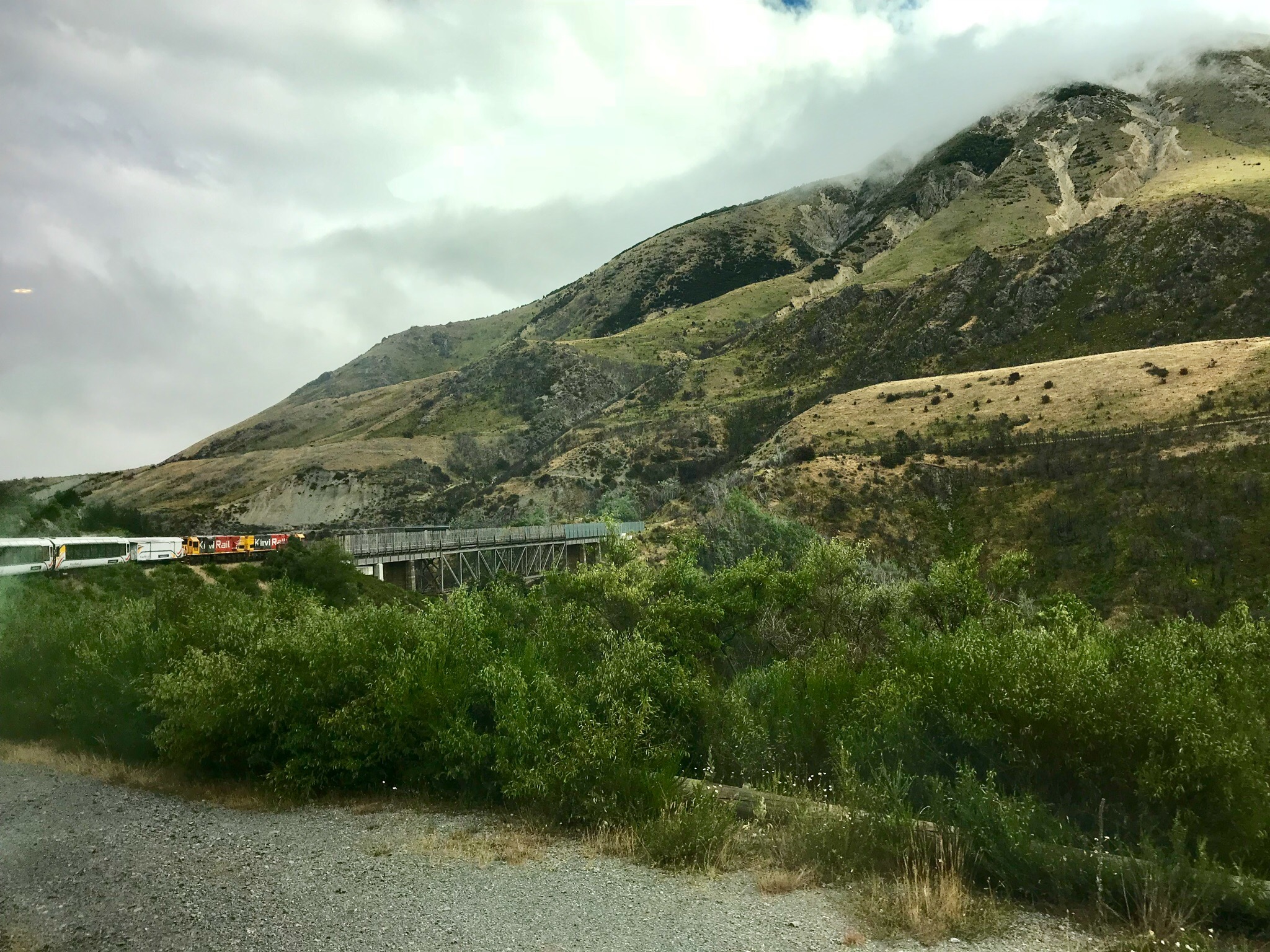 Abfahrt! Kurz ein paar Fakten: Die Strecke von Küste zu Küste ist 223 Kilometer lang und zwingt den Zug, 730 Höhenmeter bis zum Scheitelpunkt am Arthur’s Pass zu überwinden. Dazu muss im Bereich des genannten Tunnels auch die Lok gewechselt werden. Die Landschaft ist traumhaft schön und wechselt häufig. Langeweile kommt hier wahrlich nicht auf. Doch seht selbst: