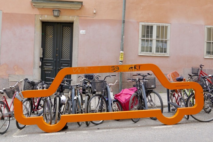 In einer Seitenstraße fällt uns diese Fahrradparkstation auf, die auf eindrückliche und originelle Weise veranschaulicht, wie viele Fahrräder auf einen ehemaligen Autostellplatz passen.