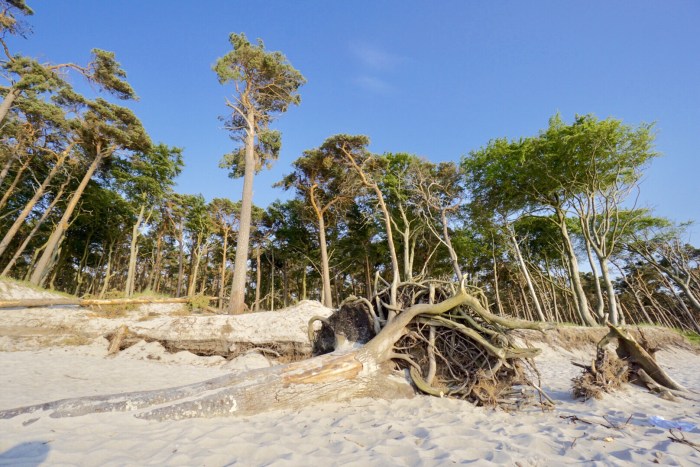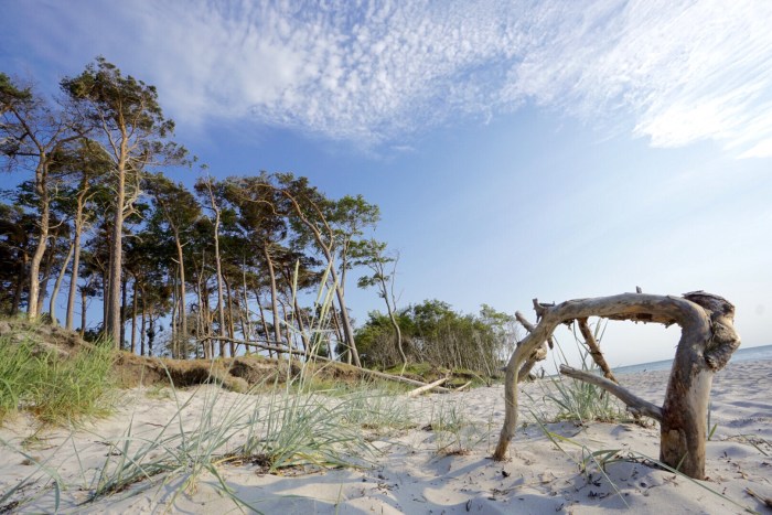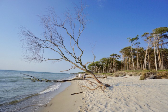 Am späteren Nachmittag dann Kontrastprogramm. Der phantastische Weststrand nördlich von Ahrenshoop, vom Fernsehsender ARTE zu einem der zehn schönsten Strände weltweit gewählt, wartet auf unseren Besuch. Wild, zerzaust und recht einsam lohnt er immer einen Abstecher. Er ist nur zu Fuß zu erreichen. Der nächstgelegene Parkplatz ist etwa 1 1/2 km entfernt, was die fußfaulen Massen erfreulicherweise vom Besuch abhält. Dieses Mal ist der Fußweg vom Parkplatz durch den Wald zum Strand beschwerlich. Trilliarden von Stechmücken fallen über uns her! Aber da müssen wir buchstäblich durch. Am Strand stelle ich fest, dass ich eine dicke Lippe riskiert habe – die Stiche an Hals, Armen und Beinen zählen wir erst gar nicht …