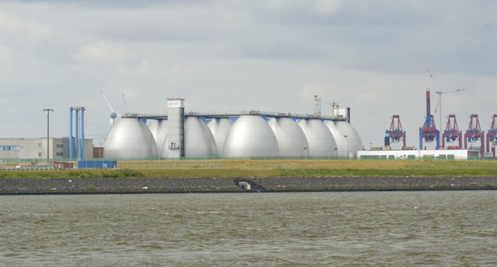 Zu dieser recht frühen Stunde sind noch nicht so viele Leute unterwegs. Und so sichern wir uns die Pole Position oben auf der Fähre 62, was uns nicht nur einen tollen Rundumblick, sondern auch eine steife Brise sowie eine ordentliche Ladung Gischt beschert. So schippern wir stadtauswärts auf der Elbe herum und genießen das, was uns links und rechts so alles geboten wird. Da wären zum einen der Industriehafen in all seinen Facetten, …