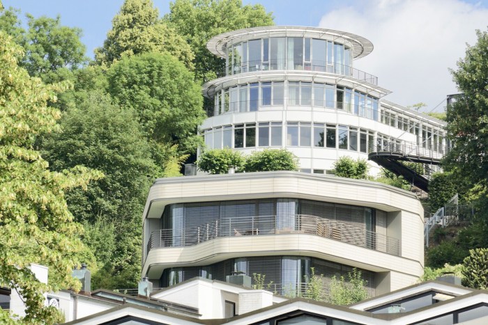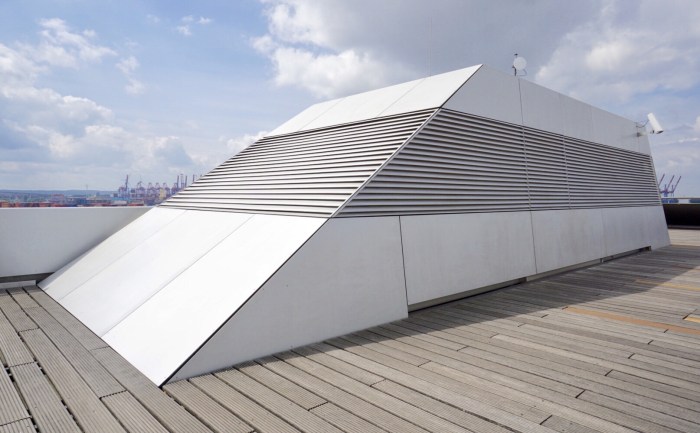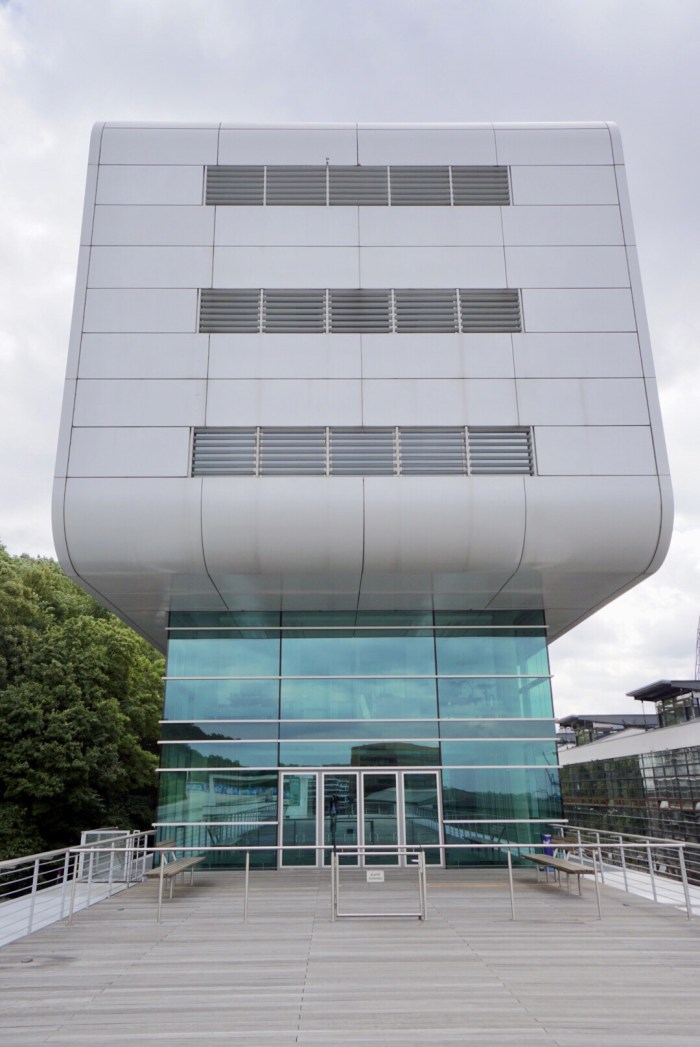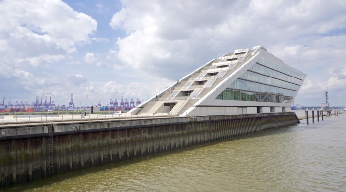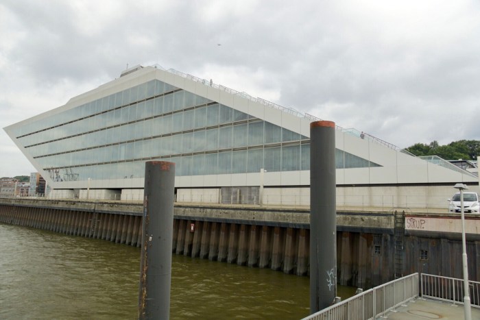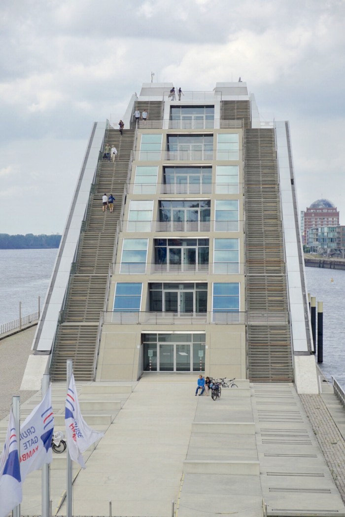Und hier isses nun, das futuristische Bürogebäude „Dockland“, direkt neben dem heute verwaisten Kreuzfahrtterminal. Kommt euch bekannt vor? Richtig! Ich habe euch diese wie eine schnittige Yacht anmutende Schönheit eben schon mal von der Wasserseite aus untergejubelt. Und auch als Titelbild 😎. Eine sportlich herausfordernde Freitreppe führt zu einer öffentlichen Dachterrasse, die uns einen fantastischen Fernblick auf den Hafen und das Elbtal bietet.
