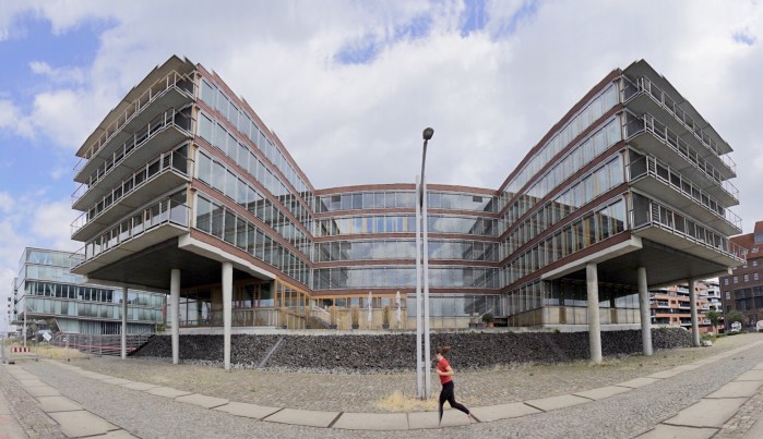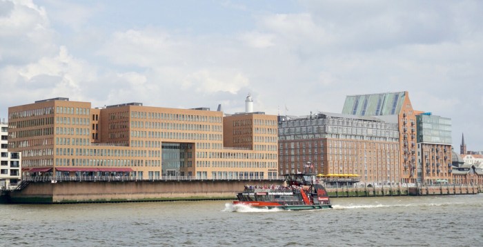 … und laufen dann immer möglichst nah am Wasser entlang Richtung Dockland. Auf dem Weg dorthin drängen sich noch einige schmucke Neubauten in dieser offenbar aufstrebenden, schönen Ecke Hamburgs auf. Ein paar Wohnbauten sind darunter, doch in der Mehrzahl finden sich Büros hier. Manche Gebäude stehen so nah am Wasser, dass die Kameras ihre Panorama-Funktionen unter Beweis stellen müssen.