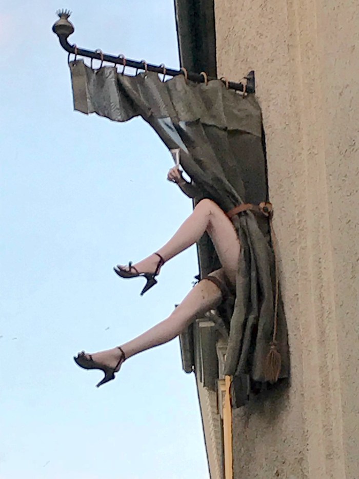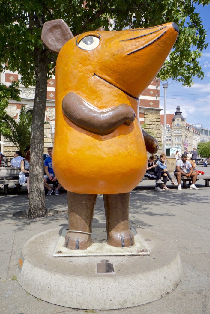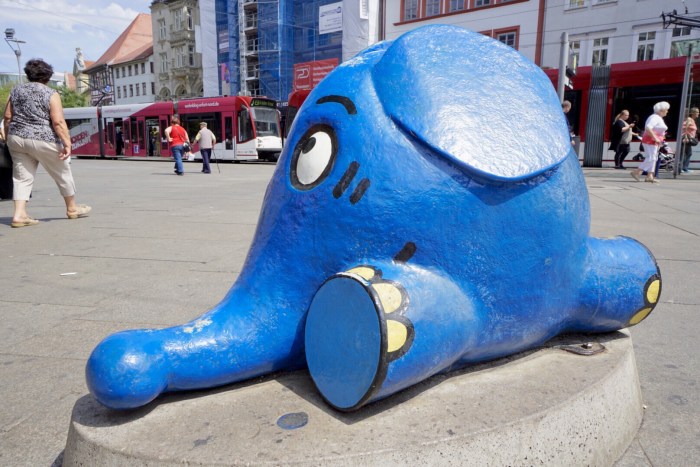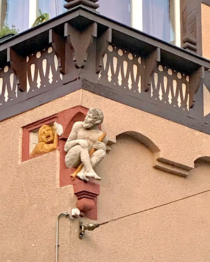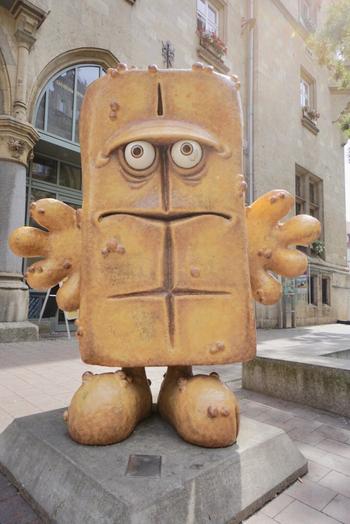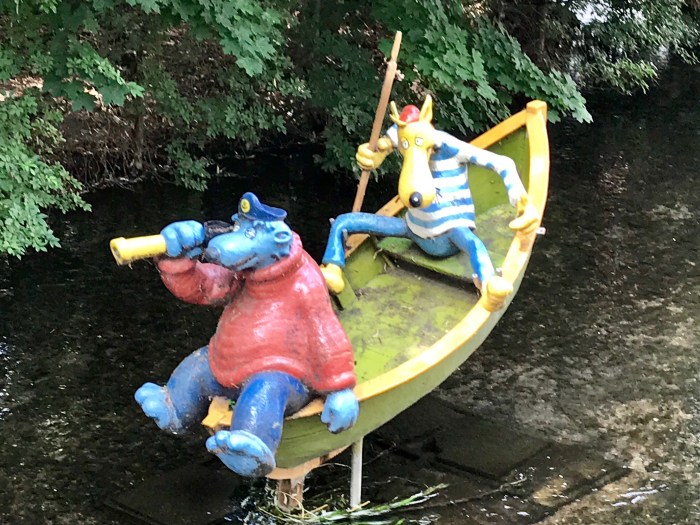 Das Städtchen macht schon auf den ersten Metern Eindruck und wird es auch weiter tun, wie sich im Laufe der beiden Tage hier herausstellen wird. Die Atmosphäre ist lebhaft, aber nicht hektisch. Und, für mich ja immer wichtig: sehr fußgängerfreundlich. Von Anfang an fallen mir überall in der Innenstadt verteilte, sehr vertraute Gestalten auf, die ich kommentarlos hier immer mal wieder einstreuen werde. Zum Beispiel diese beiden hier: