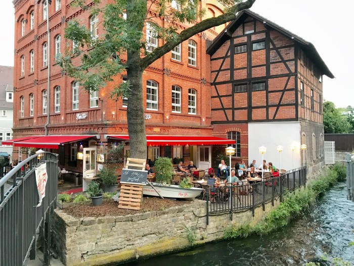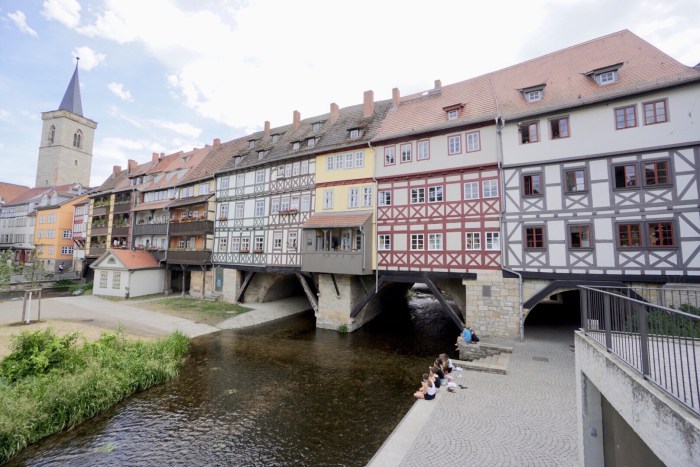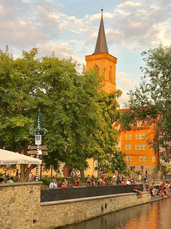Nach kurzem Boxenstopp im Hotel treibe ich mich an Erfurts Wahrzeichen, der Krämerbrücke herum, eine beidseitig mit Fachwerkhäusern bebaute Brücke. Man kann über sie und um sie herum schlendern, oder es sich am Wasserlauf der Gera gemütlich machen, was bei den sommerlichen Temperaturen wahrlich nicht die schlechteste Option ist.