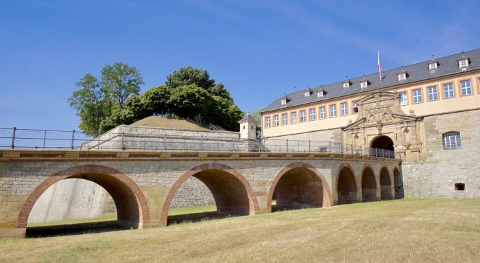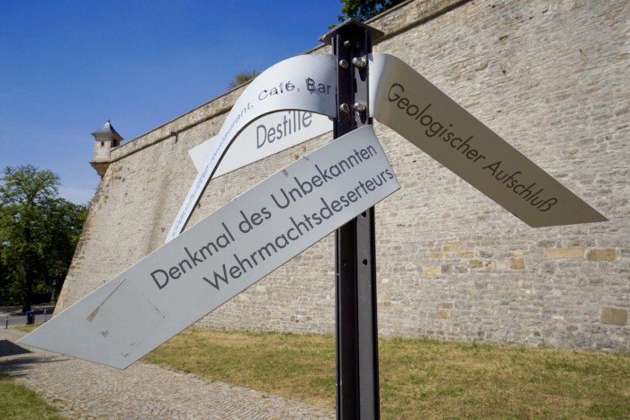 Kurz Anlauf genommen, und schwups bin ich oben auf dem weitläufigen Gelände der Zitadelle Petersberg, einer der größten und am besten erhaltenen Stadtfestungen Europas. Sie blieb während der beiden Weltkriege und auch in der Nachkriegszeit militärisch genutztes Gelände. Ab 1963 war das Gelände teilweise für die Öffentlichkeit zugänglich. Nach der Wiedervereinigung 1990 wurde es umfangreich saniert und wird heute vielfältig (touristisch, kulturell, Wohnungen, Ämter) genutzt.