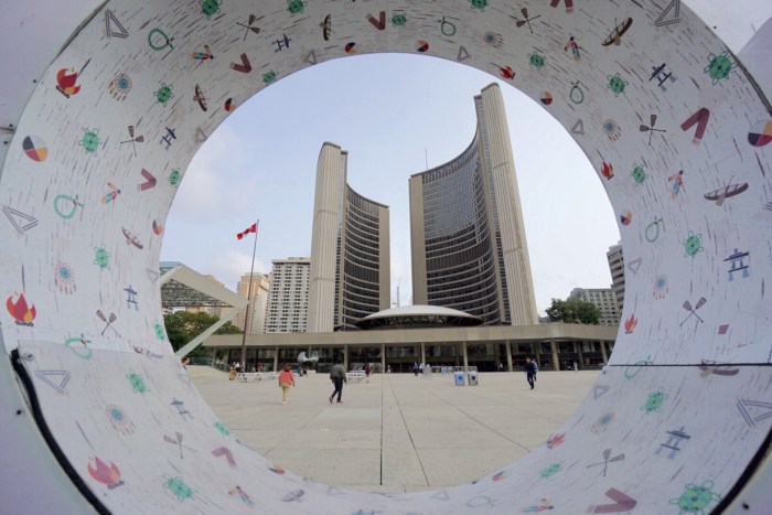 Und gleich nebenan schlägt das Herz der Stadt, der Nathan Phillips Square (heutiges Titelbild) mit altem …