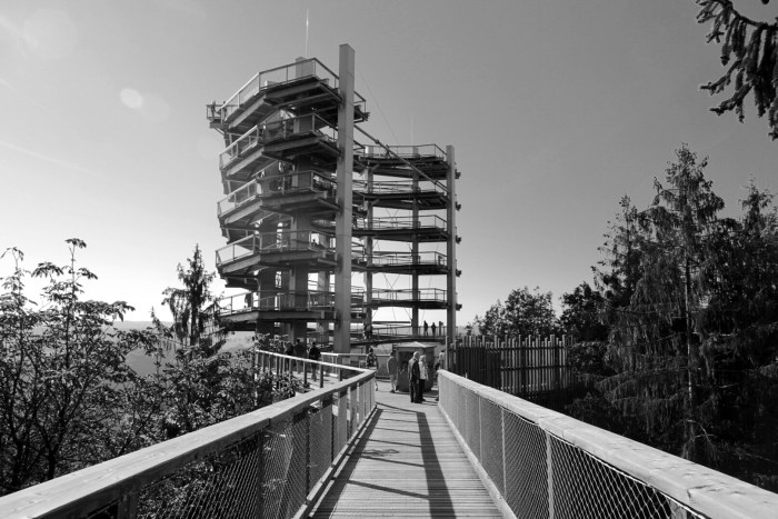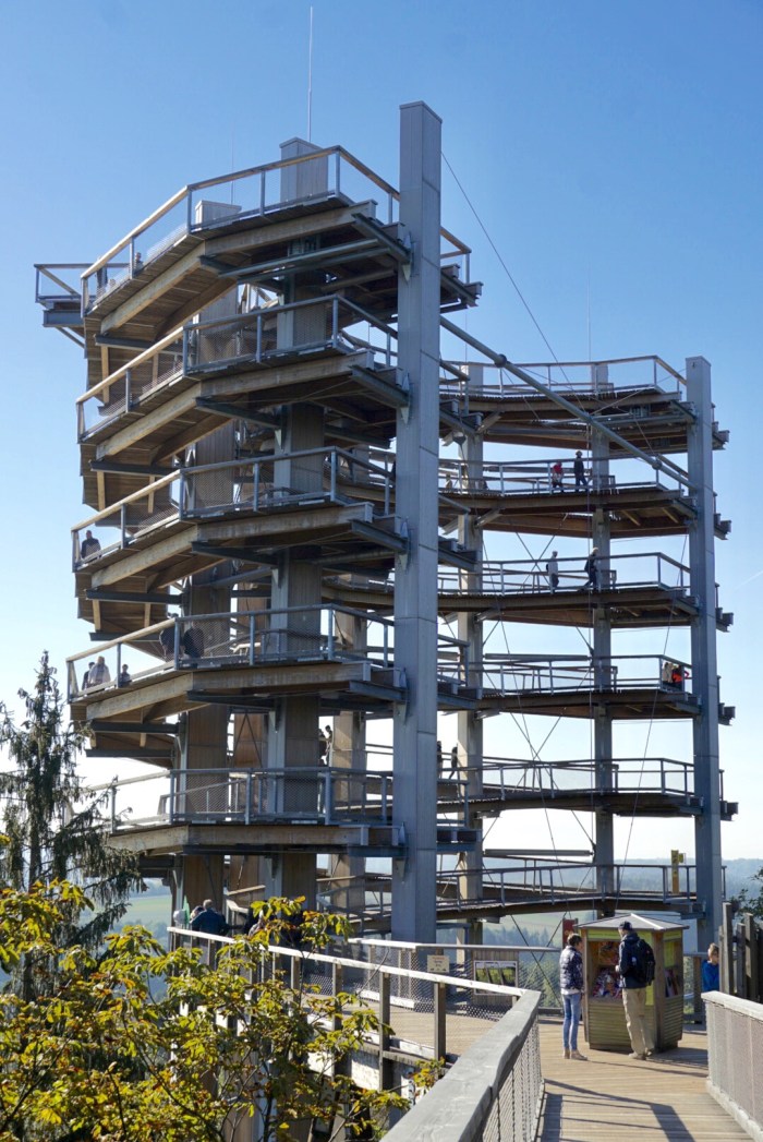Am Ende des Pfades wartet der 42 Meter hohe Aussichtsturm darauf, von uns erklettert zu werden. Nun gut, das war jetzt etwas übertrieben … In Wahrheit führt eine barrierearme Rampe hinauf, die mit einer maximalen Steigung von sechs Prozent auch für Kinderwagen und Rollstühle befahrbar ist.