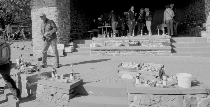 Mittlerweile sind auch die beiden anderen Tesches aufgetaucht. Und so spazieren wir zu viert ein Weilchen durch den Wald und erhaschen einen Blick von dem 180 Meter über dem Fluss gelegenen Aussichtspunkt Cloef auf die Saarschleife. Da sich von dort der gleiche schöne Anblick wie vom Turm bietet, nur nicht von ganz so weit oben, widme ich mich nebenbei noch dem munteren Verkaufstreiben hinter unserem Rücken. Ein Schnäpschen gefällig? Hatte der Herr auch im Angebot 😎.