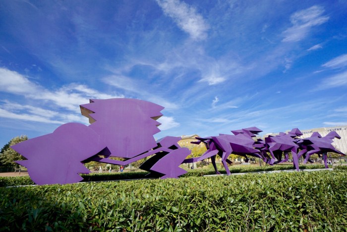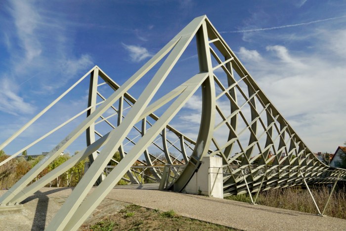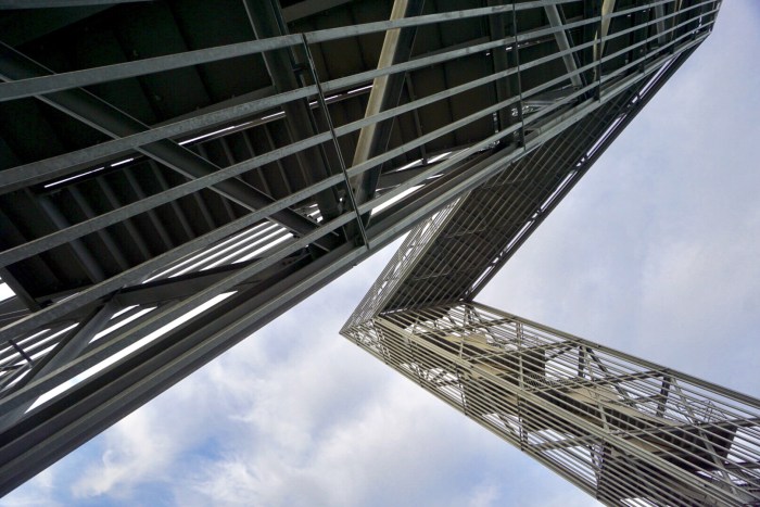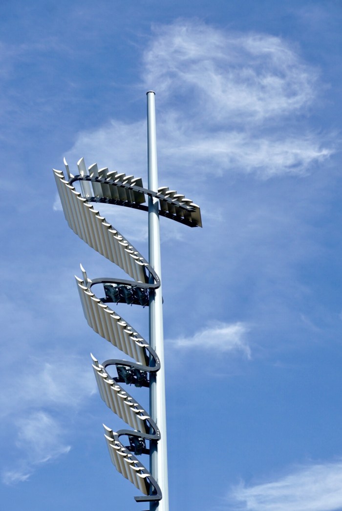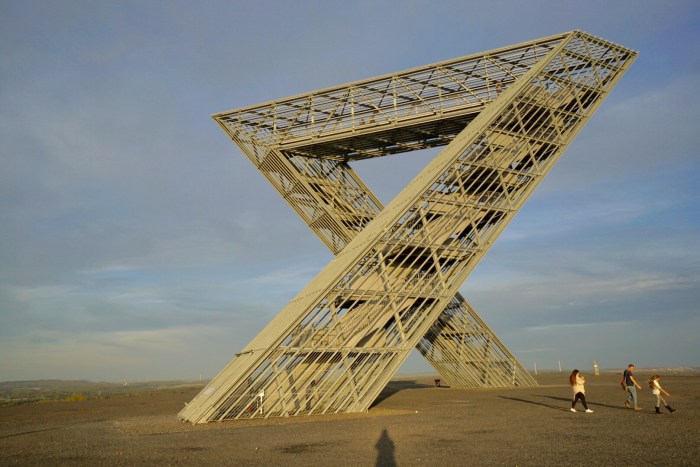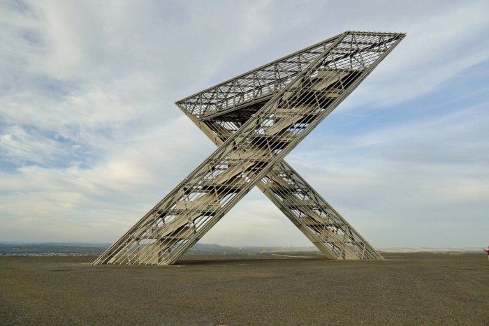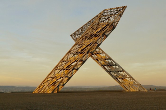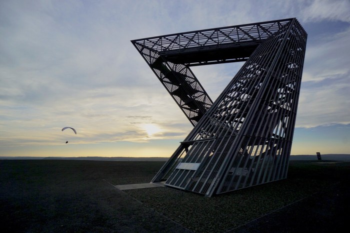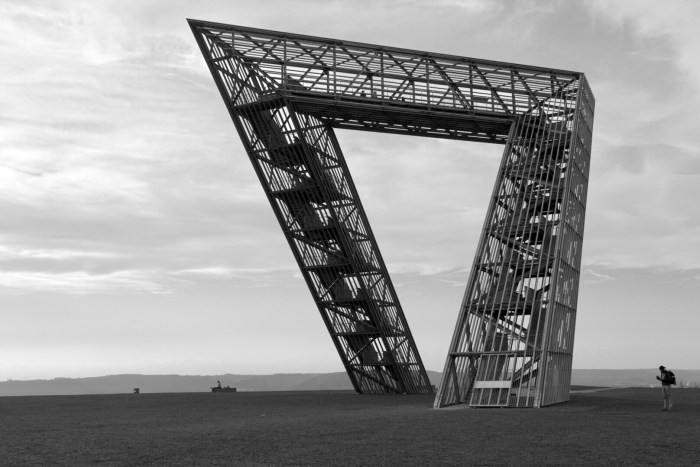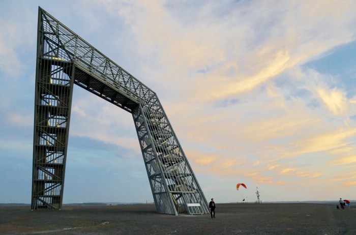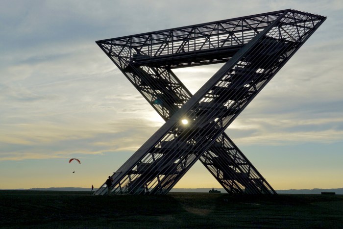 Die begehbare Großskulptur stellt in abstrakter Form eine Tür in die Zukunft dar. Von jeder Seite sieht sie anders aus. Mal ist es ein Zett, dann ein Torbogen oder ein auf der Spitze oder seiner Basis stehendes Dreieck. Kurz: das Teil ist der Hammer! Doch seht selbst: