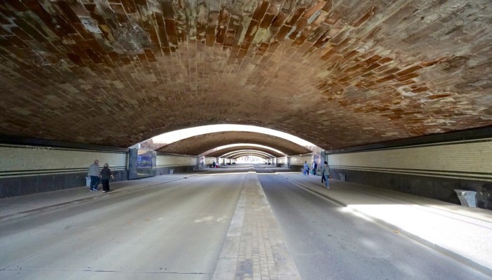 Ein Blick auf die Uhr. Nun aber auf ins Städtchen! Durch die Unterführung …
