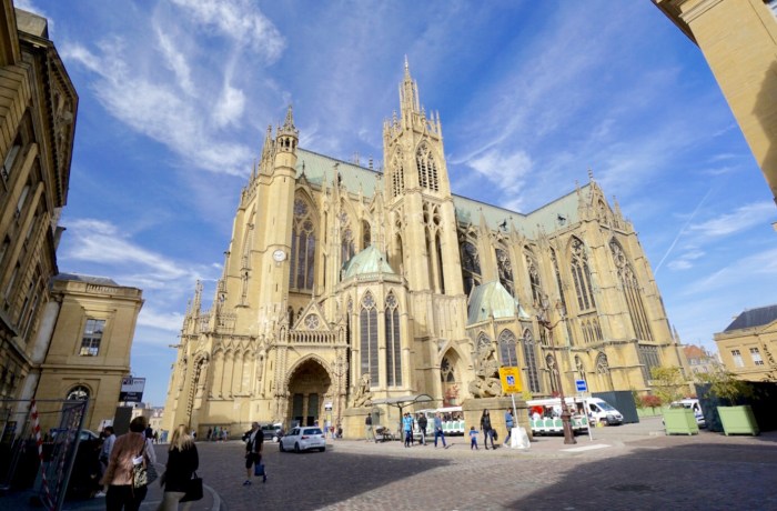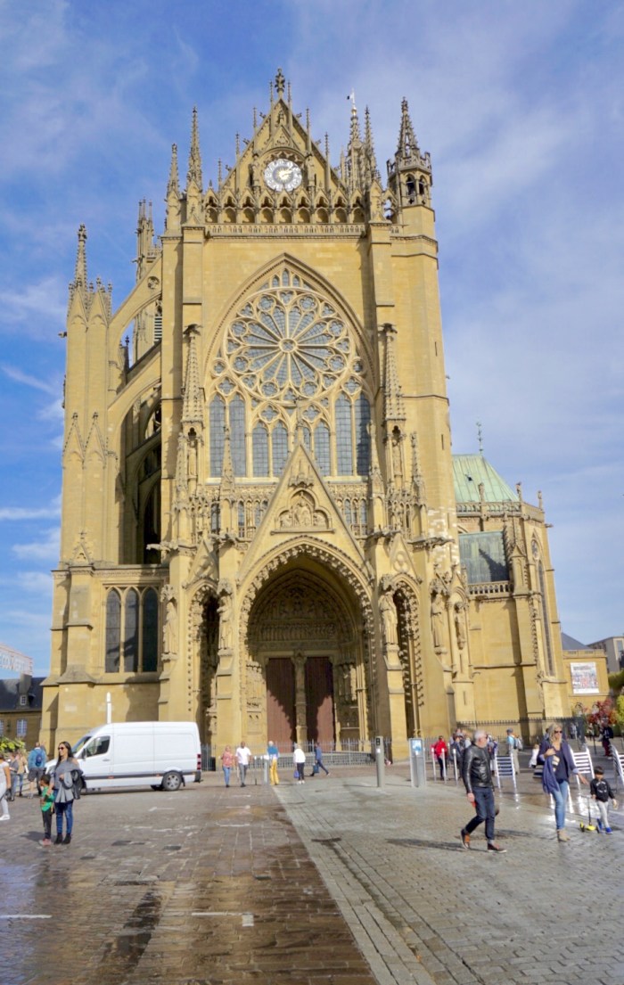 Wir lassen uns durch die Fußgängerzone treiben und stehen schon bald vor dem sicher bekanntesten Gebäude der Stadt. Darf ich vorstellen?: Die Kathedrale von Metz, eine der wohl schönsten gotischen Kirchen in Frankreich, und mit ihrem 42 Meter hohen Gewölbe eine der größten gotischen Gebäude Europas. Die imposante Fensterfläche (teilweise von Marc Chagall gestaltet) von insgesamt 6.500 m2 verschaffte ihr übrigens den charmanten Spitznamen „Laterne Gottes“. Je nach Lichteinfall spielt sich durch sie im Innern der Kirche eine beeindruckende „Lightshow“ ab. Die Innenaufnahmen sind von Stefan. Danke dafür!