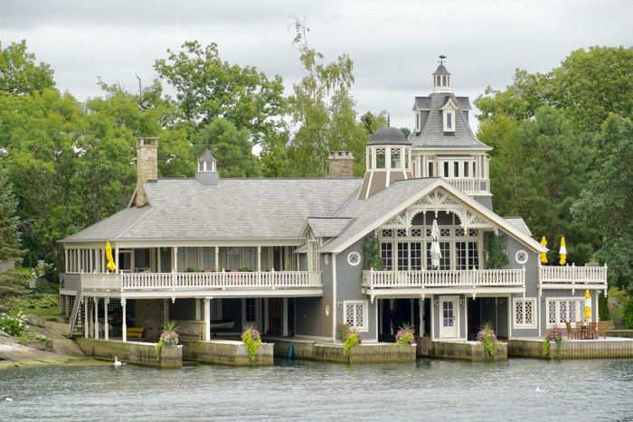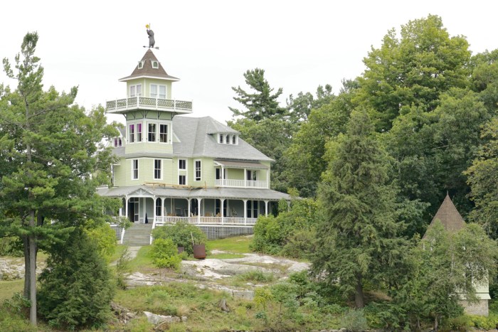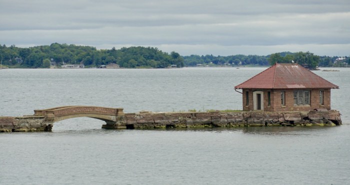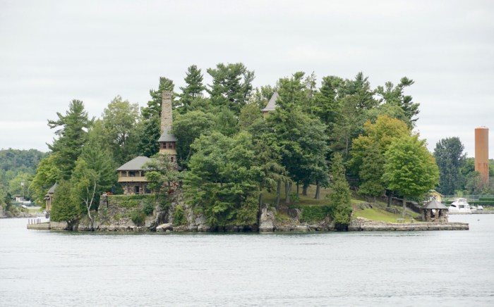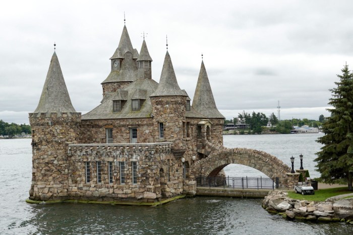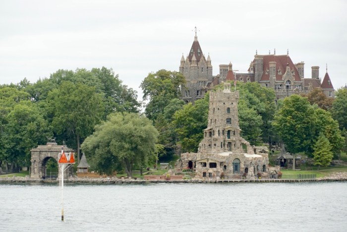 Nach einer Weile nähern wir uns der architektonischen Hauptattraktion der Region. Auf Heart Island thront Boldt Castle, um das sich eine Geschichte rankt, die glatt aus einem Märchen entlehnt sein könnte. Es war einmal … ein armer Kerl namens Georg Boldt, der Mitte des 19. Jahrhunderts aus dem fernen Deutschland kam, in die USA einwanderte und dort eine glorreiche Karriere à la „Vom Tellerwäscher zum Millionär“ hinlegte. Bald war er so reich, dass er Besitzer des berühmten Waldorf-Astoria Hotels in Manhattan wurde. Er heiratete eine wunderschöne Frau und schenkte ihr eine der 1.000 Inseln, die er in Herzform umgestalten und ein Schloss mit 120 Zimmern bauen ließ. Für die Schwiegermutter wurde auch gebaut – zur Sicherheit auf der Nachbarinsel. Doch das Schicksal war grausam. Noch bevor das Märchenschloss fertig gebaut war, starb die geliebte Gattin. Voller Trauer und Verbitterung stoppte er 1904 die Bauarbeiten und betrat Heart Island nie wieder.