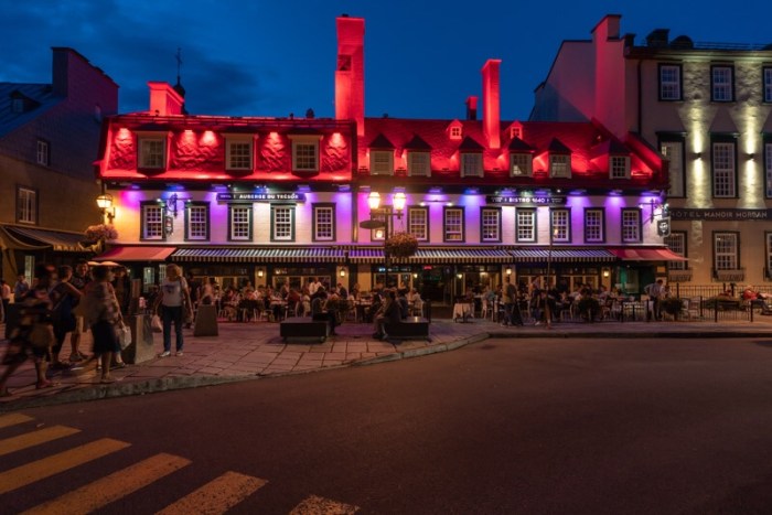 Am späten Nachmittag rollen wir entlang der Promenade des Gouverneurs herunter bis zur Terrasse Dufferin und warten den Beginn der Dämmerung ab. Auf der Toilette (😂) in einem der Restaurants in der Gegend komme ich ins Gespräch mit Christine aus Toronto. Wir verquatschen uns ausgiebig, und die wartenden Männer machen sich nichtsahnend so ihre Gedanken. Ihrer wundert sich, warum sie das inzwischen gelieferte Essen kalt werden lässt, während Stefan argwöhnt, ich hätte mich durch den Hinterausgang verdrückt und läge längst gemütlich im Hotelbett. Ja, so kann’s gehen.