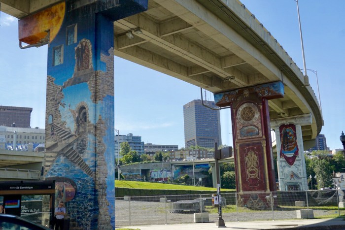 Die teils als Hochbahn durch die Stadt geführte Schnellstraße, die unseren Weg kreuzt, lenkt mit Kunst auf Beton gekonnt von ihrem Mangel an Schönheit ab.