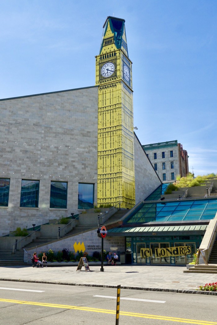 … und stehen schon bald vor dem Musée de la Civilisation, das wegen einer der aktuellen Ausstellungen mal eben den Big Ben in knallgelb an die Museumsfassade geklatscht hat. Wer beim Titel der Ausstellung gleich an The Clash denkt, ist mit mir in bester Gesellschaft. Ich sag nur: London calling!