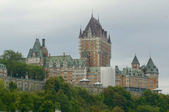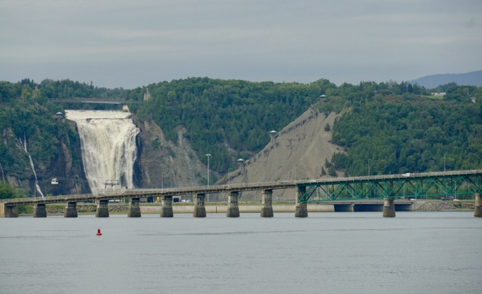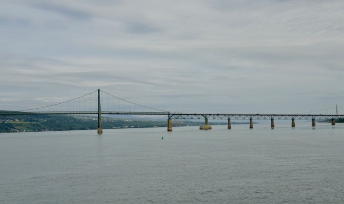 Nicht nur in der Stadt, auch auf dem Schiff ist es nicht besonders voll. Die beginnende Nachsaison lässt grüßen. Das ist uns sehr recht, gewährt es uns doch volle Bewegungsfreiheit und viel Auslauf auf dem Schiffchen. Und so genießen wir mal stehend, mal sitzend die Aussicht auf die Landschaft, die die Stadt umgibt, zur Île d’Orléans führende Brücken, einen Wasserfall, den wir in ein paar Tagen noch etwas näher unter die Lupe nehmen werden, etwas anders geartete Schiffchen vor Industrieanlagen …