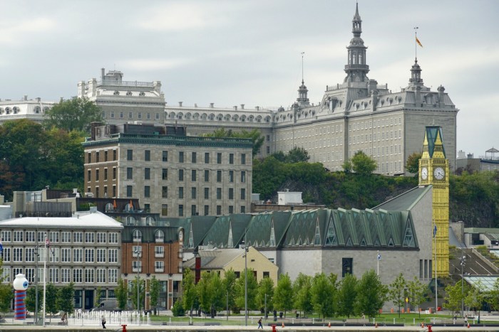 … und Altstadt. 35 Minuten später erreichen wir rechtzeitig das Ausflugsschiff, das uns eineinhalb Stunden auf dem üppigen Gewässer des hier rund 800 Meter breiten St. Lorenz Stroms herum schippern wird, und wir mit vielen interessanten Infos vom kostümiertem Live-Moderator beschert werden.