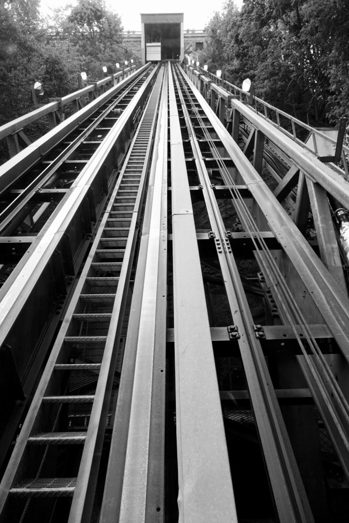 Wir schlagen uns quer durch die Gässchen der Unterstadt und nehmen die Dienste des Funiculaire in Anspruch, der uns schnell und bequem hoch in die Oberstadt katapultiert. Die Standseilbahn von 1879 überwindet auf 64 Metern Länge einen Höhenunterschied von 59 Metern. Die maximale Neigung beträgt 45%. Ursprünglich war sie als Wasserballastbahn konzipiert, wurde dann aber 1907 elektrifiziert.