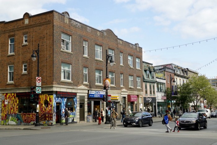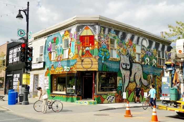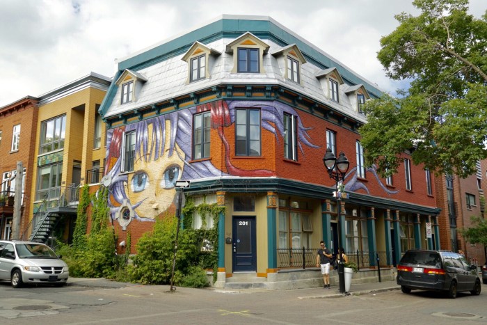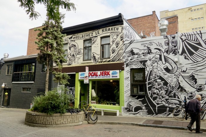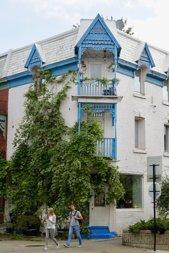 Gut abgefüllt haben wir jetzt wieder Kraft und Energie, durch diese sehr charmante Ecke Montréals zu schlendern. Wir finden eine ruhige, baumbestandene Wohngegend mit buntbemalten Häusern, lauschigen Cafés, Grünflächen und kleinen, schicken Läden vor. Neben denjenigen mit genügend Kleingeld lassen sich hier auch zunehmend Künstler nieder. Und so schaut es hier aus:
