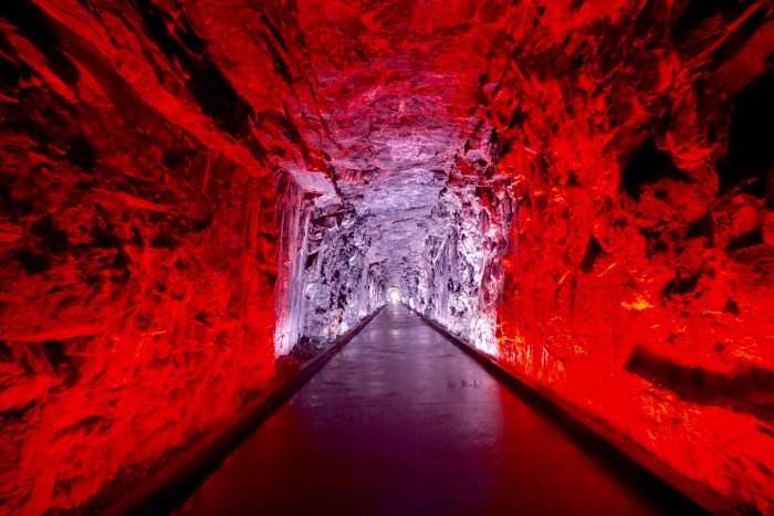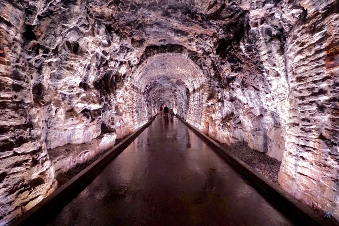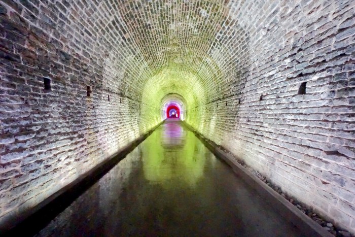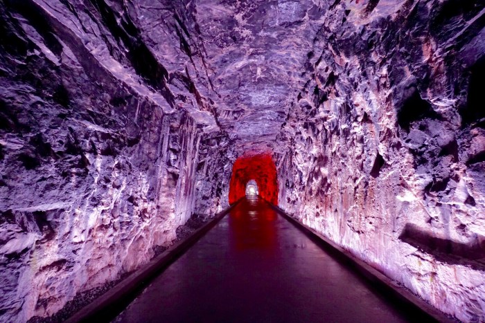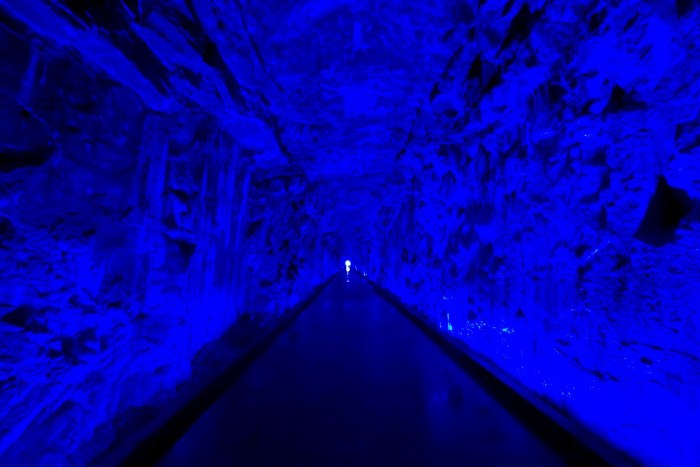 Was soll ich sagen? Es ist ein Meisterwerk der Ingenieurskunst, Architektur und Geologie! Und natürlich perfekt in Szene gesetzt durch eine sehr originelle Lightshow, bei der selbst eine virtuelle Zugdurchfahrt nicht fehlt. Ich bin schockverliebt, und das nicht nur wegen des angenehm feucht-kühlen Klimas, das dort als Kontrastprogramm zu draußen herrscht. Das erklärt an dieser Stelle auch mein Unvermögen, mich bei der Auswahl der Fotos, die ich euch hier präsentiere, zu beschränken. Dieser Tunnel sieht einfach in den unterschiedlichen Abschnitten mit seinem unterschiedlich bearbeiteten Mauerwerk und den ständig wechselnden Farben immer wieder anders und immer schön aus. Nehmt also das: